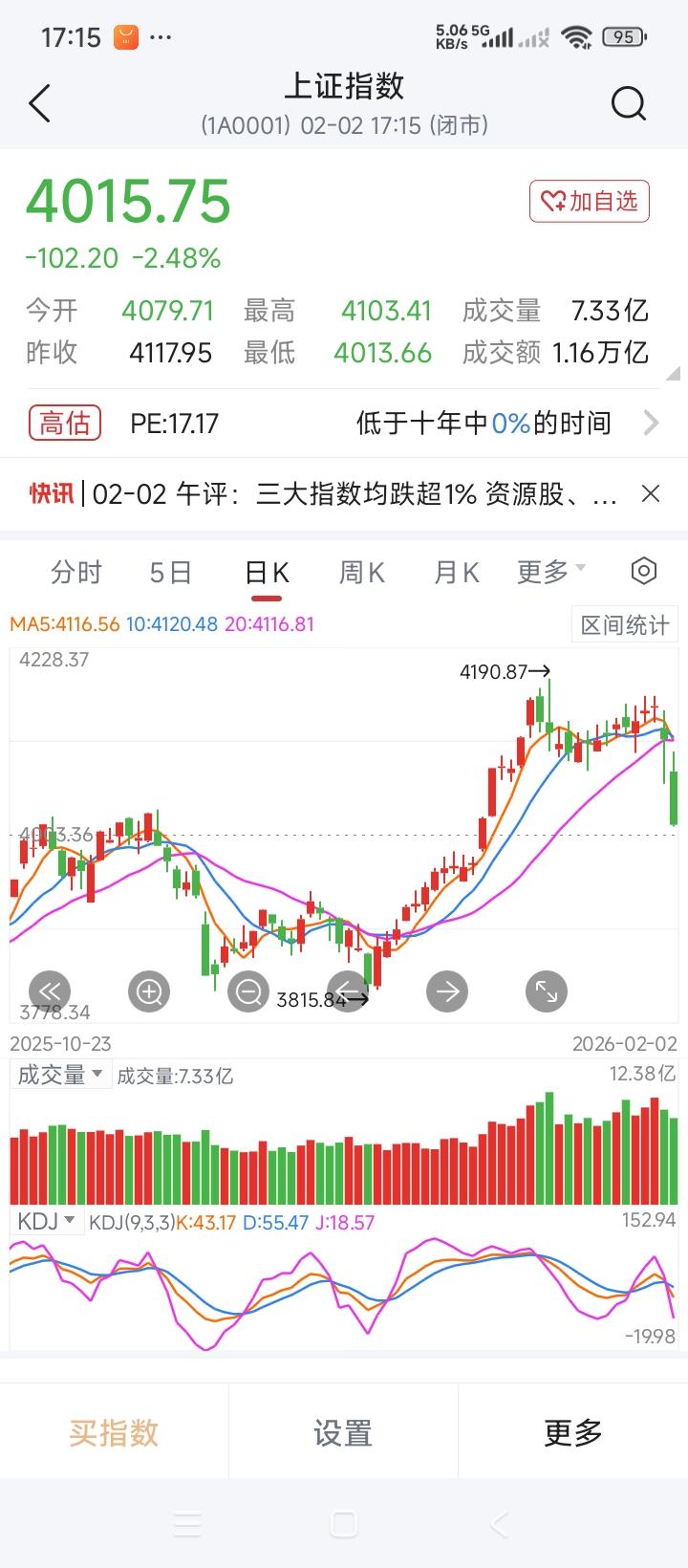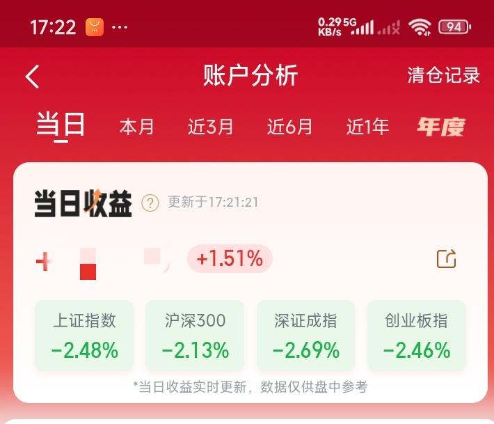 今日股市大跌,跌幅惊人。 三大股指都有2%以上的跌幅。 料到今日会下挫,但没料到跌幅如此之大。 有股友说,断头铡刀已形成。 但我说,明天可能会有一个反弹。 因为这两天跌得太多了,应该缓一缓。所以明天可能会平开高走,或高开高走,又或者是低开高走。 总之明天高走是大概率的事。 股市今日跌了近2.5%,本人还赚了1.51%,还算有所安慰。 赚了的股票全部清了,换了新某动力。 是错是对明天见分晓。
