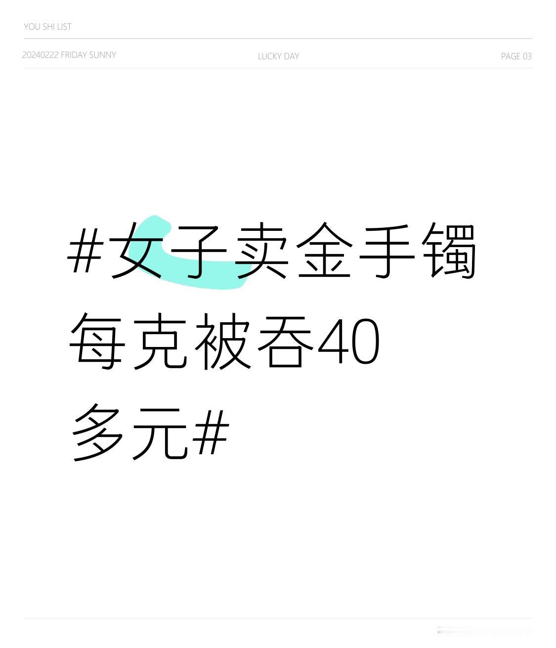 女子卖金手镯每克被吞40多元 女子卖金手镯每克被吞40多元,这事儿听起来就闹心!黄金回收市场这水也太深了。就说这每克被吞40多元,要是手镯有几十克,那损失可不小。有些不良商家可能会以各种理由压价,像纯度不够、有损耗啥的。之前也听过类似的事儿,有人卖金饰品,商家故意把价格压得很低。消费者在卖黄金时可得多留个心眼,提前了解市场行情,多找几家正规的回收店问问价,别让不良商家钻了空子,平白无故地吃大亏。