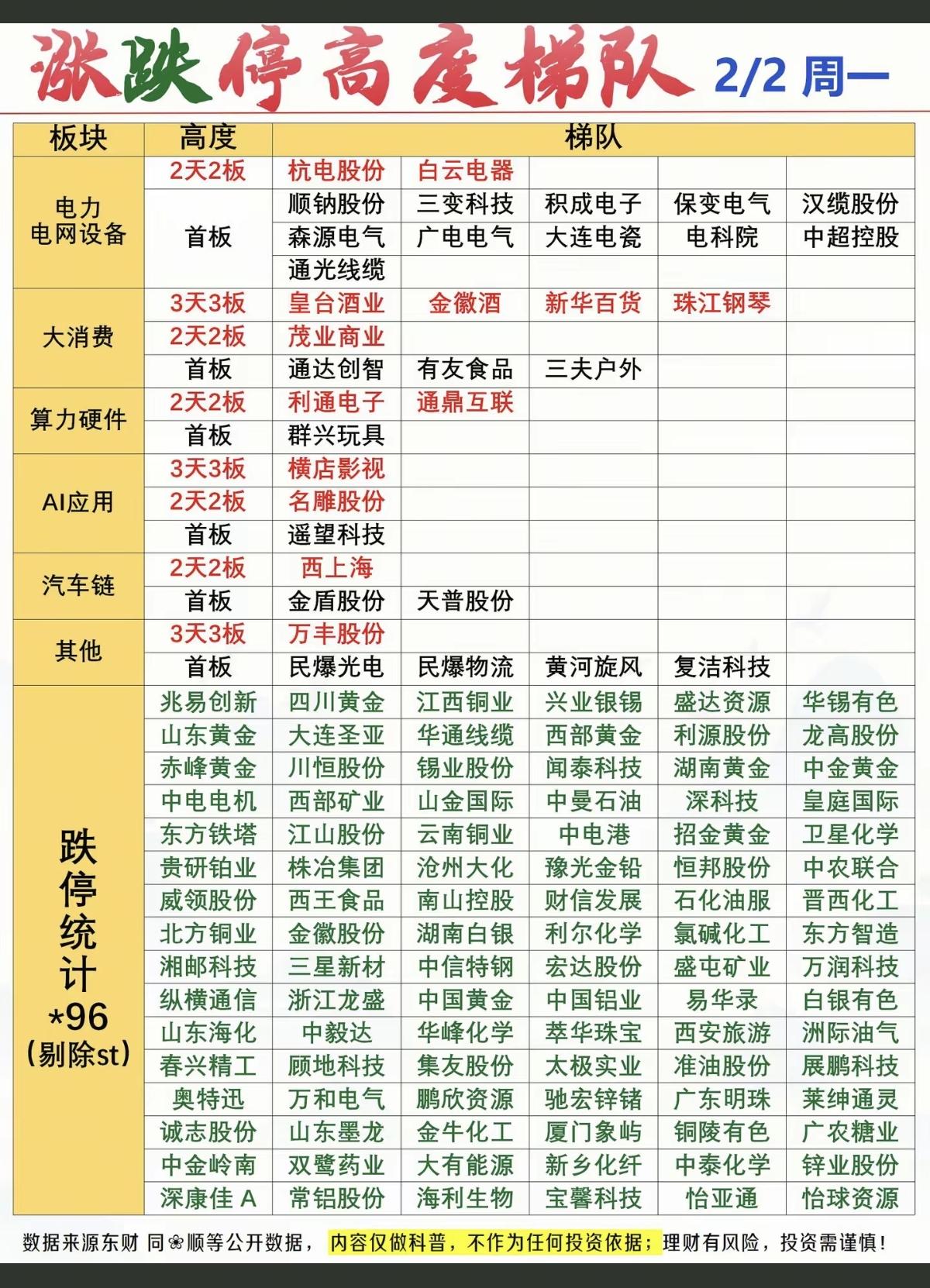 2.02周一 涨停板股票:题材+高度! 涨停板36家,跌停98家 涨跌比771:4652 焦点:电气设备,电力电网、光伏、消费 智能电网 13股涨停 白酒消费 8股涨停 人工智能AI 3股涨停 算力硬件 3股涨停