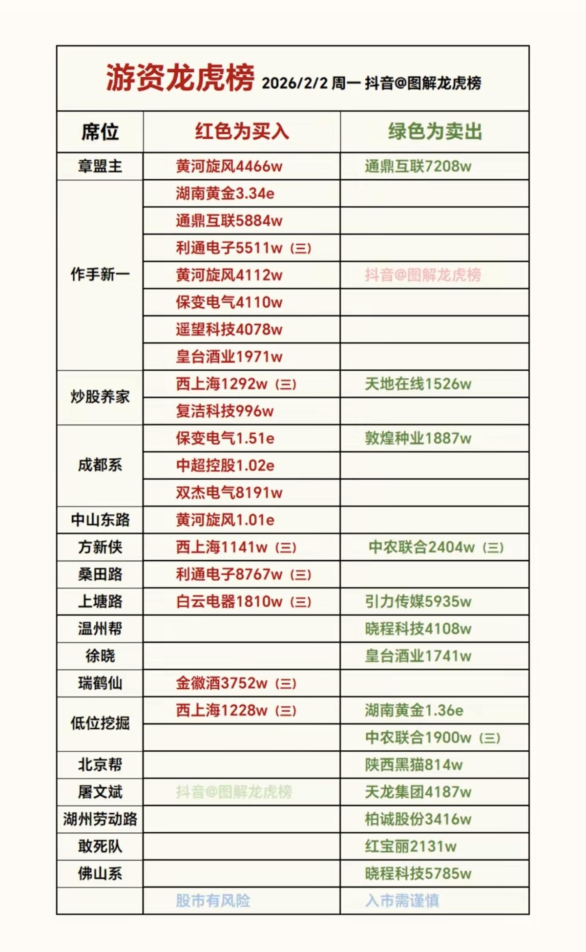 2.2周一 游资大佬 龙虎榜——数据整理! 章盟主 入 黄河旋风 上塘路 入 白云电器 成都系 入 保变电气 作手新一 入 保变电气 利通电子 保变电气、利通电子、黄河旋风成为多家游资共同抢筹焦点