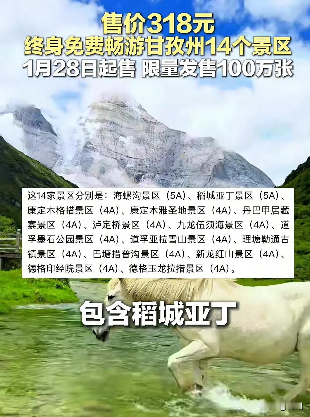 甘孜文旅局售卖“游客终身制门票”,已售出67万张。1月28日,四川省甘孜州推出一项终身制旅游卡,游客可以在有生之年内任意进出覆盖的景区,不再收取门票。 据了解,初步当地计划出售100万张,每张售价318元,总额约3.17亿元预售资金,后期可能会根据实际情况增加发售额。该活动门票从1月28日开始售卖,截止2月1日已卖出67万多张。 该门票覆盖景区包括稻城亚丁、海螺沟两个5A级景区,以及木格措、木雅圣地、丹巴甲居藏寨、泸定桥、九龙伍须海、道孚墨石公园、道孚亚拉雪山、理塘勒通古镇、巴塘措普沟、新龙红山、德格印经院、德格玉龙拉措4A级景区,单次游览全部景区需要支付1091元的门票费用。 有网友不赞同这样“吃后人粮”的营销方式,他们表示:这一波售卖下来文旅确实收入暴增,但是后面几十年的文旅收入估计就惨了。也有网友称,这样的模式也有另一个商机:大量用户买了终身票,就会惦记着每年来一次,带动交通、饮食、住宿、消费增加一样也是不错的收入。 318元终身制门票覆盖甘孜14个景区