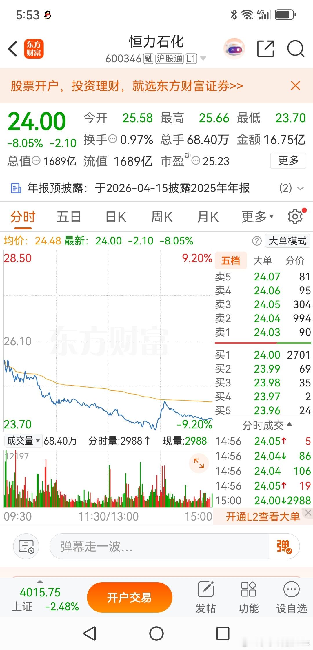 恒力石化,大阴线还是如期到来了恒力石化,我1月27日写了一篇文章,恒力石化阴云密布。其实,恒力石化的机构还算是良心机构,又在上面挺了三天的时间,即使周五跳水也还是给了离场机会。恒力石化,今天这一根大阴线直接来到了30日的,但不是那种封死跌停的那种,也依然是有一定的承接。未来是否会出现持续性大跌,我个人认为这种可能性是不大的,他基本上还是不属于过度炒作的那种,所以未来大概率是退二进一的那种走势。还在里面的朋友,稍安勿躁,你还是有机会出来的。欢迎加入我们的免费交流群财经股票