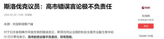 斯洛伐克公开喊话中国 近日,斯洛伐克议会国防和安全委员会副主席巴尔泰克公开支持中国,他表示:高市的言论极不负责任,非常危险。 同时,他强调:这些言论不仅无助于缓和紧张局势,反而使局势更加恶化,加剧了东亚地区的不稳定性。 高市早苗作为日本首相,她前不久在电视节目里又扯到了中国台湾问题,宣称要是台海发生危机,美日可能联合行动撤离美日公民,还说要是美军受到攻击,日本要是啥都不做就逃回去,日美同盟就会崩溃。 明眼人都能看出来,这就是在变相暗示要介入台海问题,故意挑动地区对立,本质上就是想借着美日同盟的幌子,为日本武力干预台海局势找借口。 台湾问题是中国的内政,这是国际社会公认的事实,《开罗宣言》《波茨坦公告》这些文件都明确了中国对台湾的主权,任何外国都没资格指手画脚。 更何况日本当年对台湾有过半个多世纪的殖民统治,现在还敢在台湾问题上胡说八道,纯属居心不良,带着殖民余孽的味道。高市早苗这么说,根本不是为了地区安全,而是想借着炒作“台湾有事”,推进日本的再军事化,圆它的军事大国梦,这种心思实在太险恶。 巴尔泰克之所以敢站出来说句公道话,背后是有底气的,也符合斯洛伐克的国家利益。中国和斯洛伐克今年已经建交76年了,两国友谊历经风雨,现在更是建立了战略伙伴关系,关系正处在历史高点。 双方合作早就渗透到了方方面面,去年国轩斯洛伐克电池超级工厂开工,不仅给当地带来了大量就业岗位,还推动了当地产业链供应链的完善,给中小企业发展创造了好条件。 除了经贸合作,两国在文化、教育、可再生能源、数字化等领域都有不少合作增长点,北京斯洛伐克文化中心也在推进建设,民间交流越来越热。 斯洛伐克清楚得很,和中国合作能实实在在拿到好处,而地区稳定是合作的前提。高市早苗的言论搞乱东亚局势,不仅会影响中国,也会波及到包括欧洲在内的整个国际社会的发展环境。 巴尔泰克作为负责国防和安全的官员,自然明白稳定对国家发展的重要性,所以才会公开批评高市,这既是支持中国,也是在维护自身和地区的共同利益。 而且斯洛伐克一直坚定奉行一个中国政策,在联合声明里明确承诺尊重中国主权和领土完整,反对任何干涉中国内政的行为,这次发声也是践行这份承诺的体现。 高市早苗的言论不仅遭到斯洛伐克批评,在国际上也没得到认可,反而引发了不少反对声音。中国外交部早就严正回应,指出日方没资格对中国台湾置喙,这些言论暴露了日本右翼挑事、推进再军事化的野心。 就连日本国内,不少有识之士也站出来反对,前首相鸠山由纪夫就担心,高市的做法会让日中关系严重倒退,还有学者批评她推进军备扩张,把日本往危险的路上带。 更现实的是,高市的错误言论已经让日本尝到了苦头。自从她去年11月发表涉台言论后,中日关系受到冲击,日本的旅游、水产品出口等行业直接受损。 根据日本官方数据,2025年12月中国内地访日游客人数同比大幅下降约45%,百货店的中国游客到店人数和免税商品销售额也减少了四成左右。这说明搞对抗、挑事端根本没有好结果,只会损害自己的利益。 高市早苗还想把美国拉进来当挡箭牌,说什么美日同盟义务,可美国根本没为她的谬论背书,这种捆绑策略注定行不通。 而且她的言论还违背了日本的和平宪法,强行扩大集体自卫权的解释,颠覆了“专守防卫”的原则,本质上就是军国主义思想在复活,这对整个东亚地区都是巨大的威胁。 巴尔泰克的发声,也反映出国际社会越来越看清日本右翼的真实面目,越来越多国家愿意站出来维护以联合国宪章和国际法为基础的国际秩序。 斯洛伐克作为中国的战略伙伴,不仅在经贸上和我们深化合作,还在国际事务中和我们保持相近立场,愿意和中方一起推动对话合作,维护地区稳定。这种基于相互尊重、互利共赢的伙伴关系,才是当今世界发展的主流。 现在的国际局势,稳定才能发展,合作才能共赢,这是大家都明白的道理。高市早苗要是还执迷不悟,继续在台湾问题上玩火,只会让日本在国际上越来越孤立,付出更沉重的代价。 而斯洛伐克这次公开支持中国,也给其他国家做了个好榜样,只有坚守公道、反对挑事,才能让世界更安宁,让各国人民都能从合作中受益。中国也会继续和斯洛伐克这样的友好国家深化合作,坚定维护国家主权和领土完整,和国际社会一起守护地区和平与稳定。 高市早苗的危险言论骗不了任何人,也挡不住历史发展的潮流。国际社会的公道自在人心,只有尊重他国主权、停止挑动对立,才是唯一正确的选择。斯洛伐克的发声,就是对这种正确方向的坚定支持,也让我们看到,正义和公道永远站在和平一边。