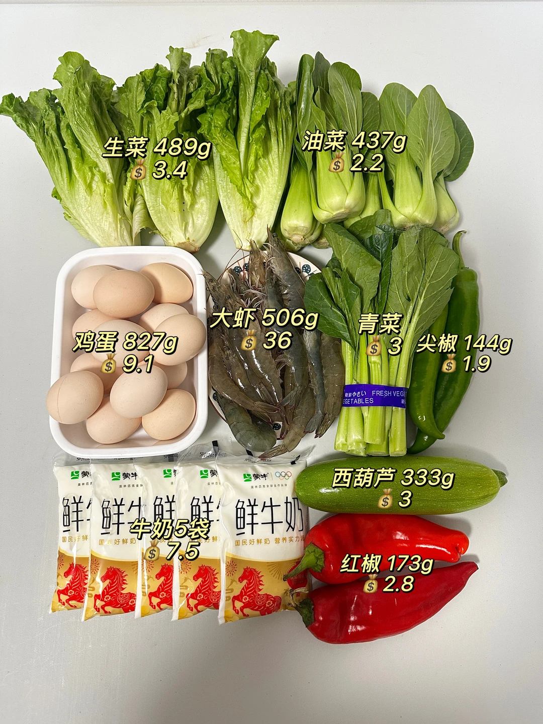 备菜第十三周 本周采购: 蔬菜💰16.3 肉蛋奶💰52.6 共计:💰68.9 🥣早餐:鸡蛋饼➕牛奶 🥣午餐:杂粮饭➕油焖大虾/西葫芦炒蛋/煎鸡排/炒青菜/油菜/青红椒 🥣晚餐:同午餐,无主食 上周部门聚餐,少吃两顿饭🤦♂️ 鸡排没吃完,本周继续吃,最后一周备餐啦,下周就放假了,回家过年,来年春天一起打卡减肥记录体重吧💪