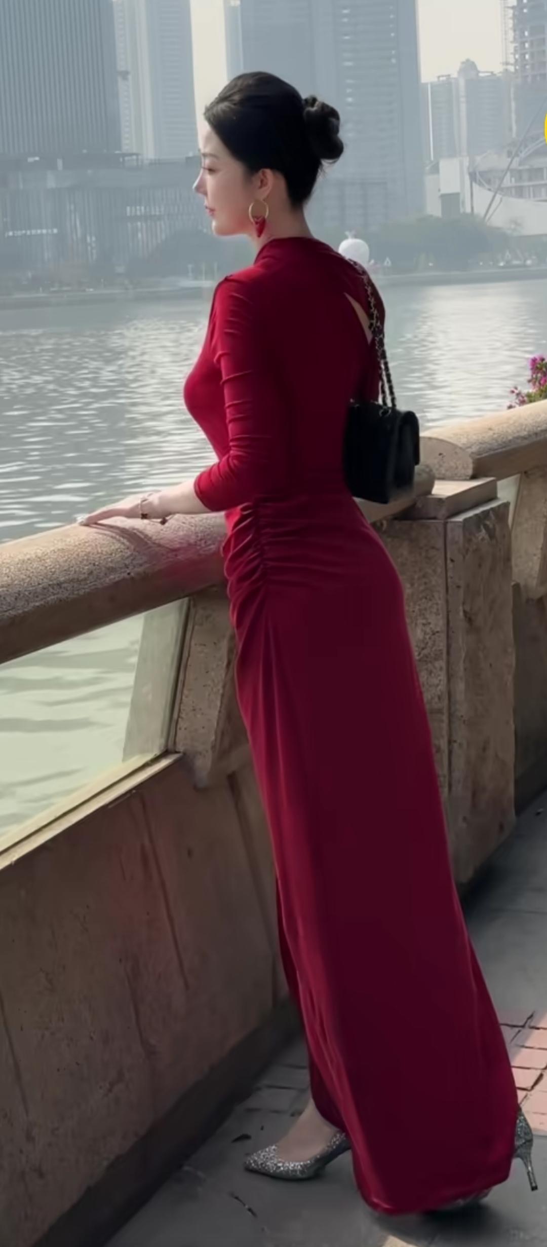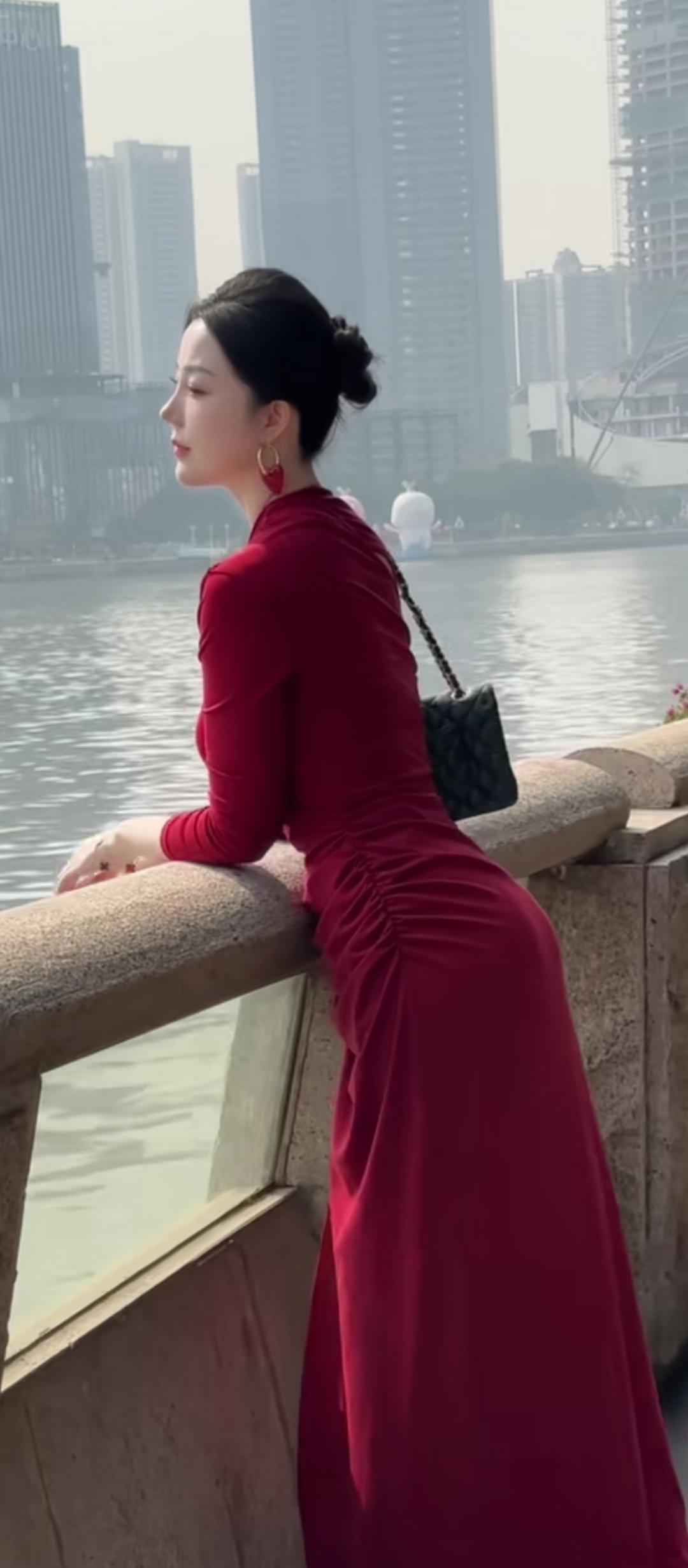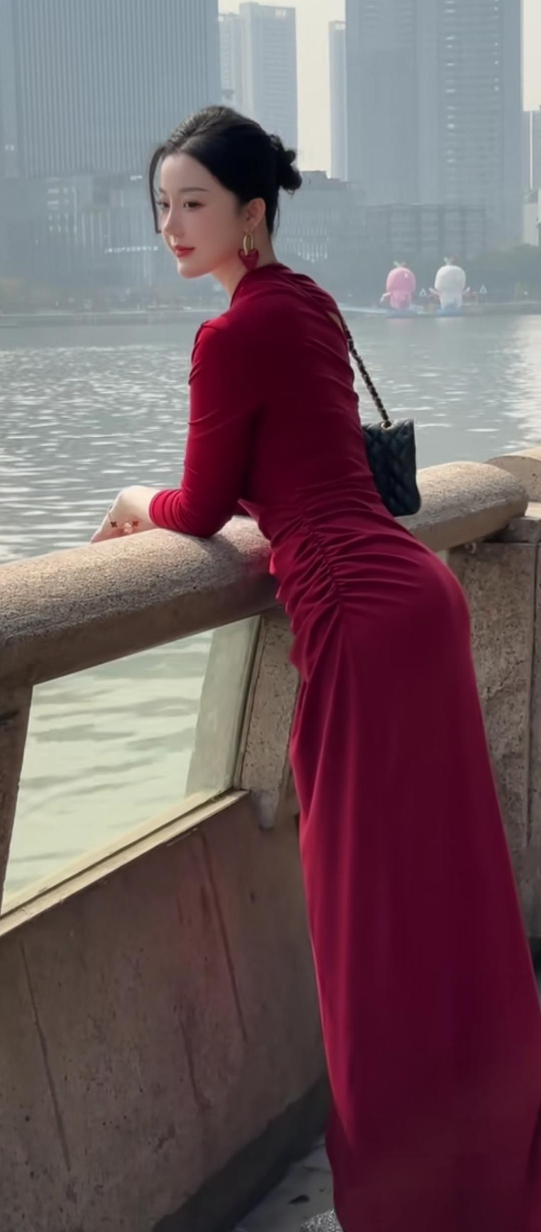 红衣倚栏,水畔思悠。