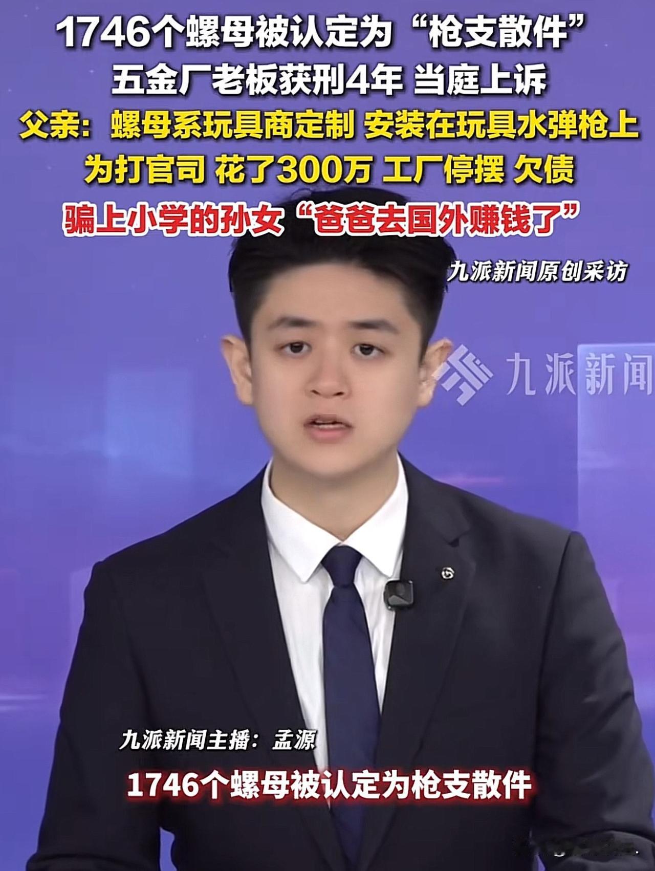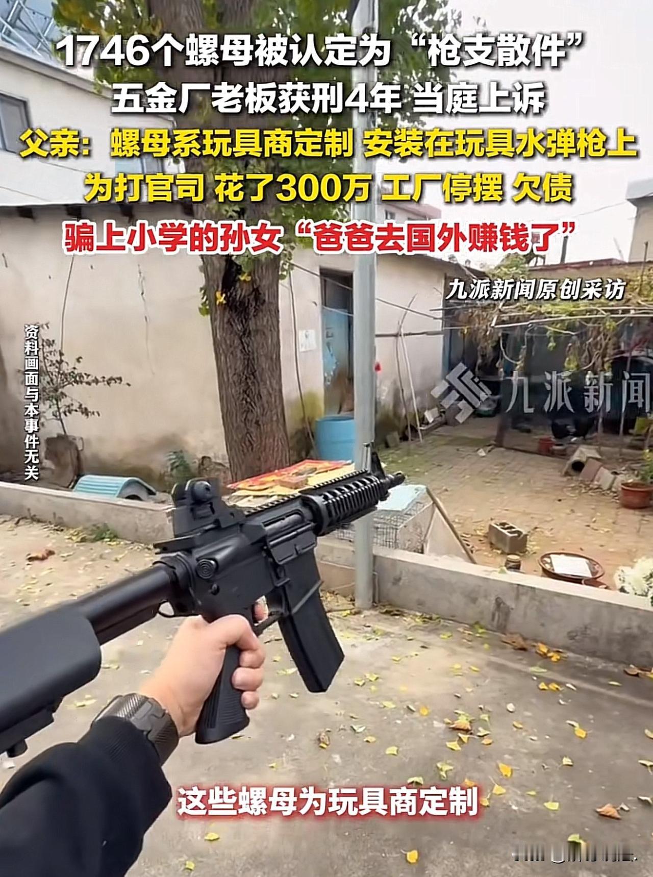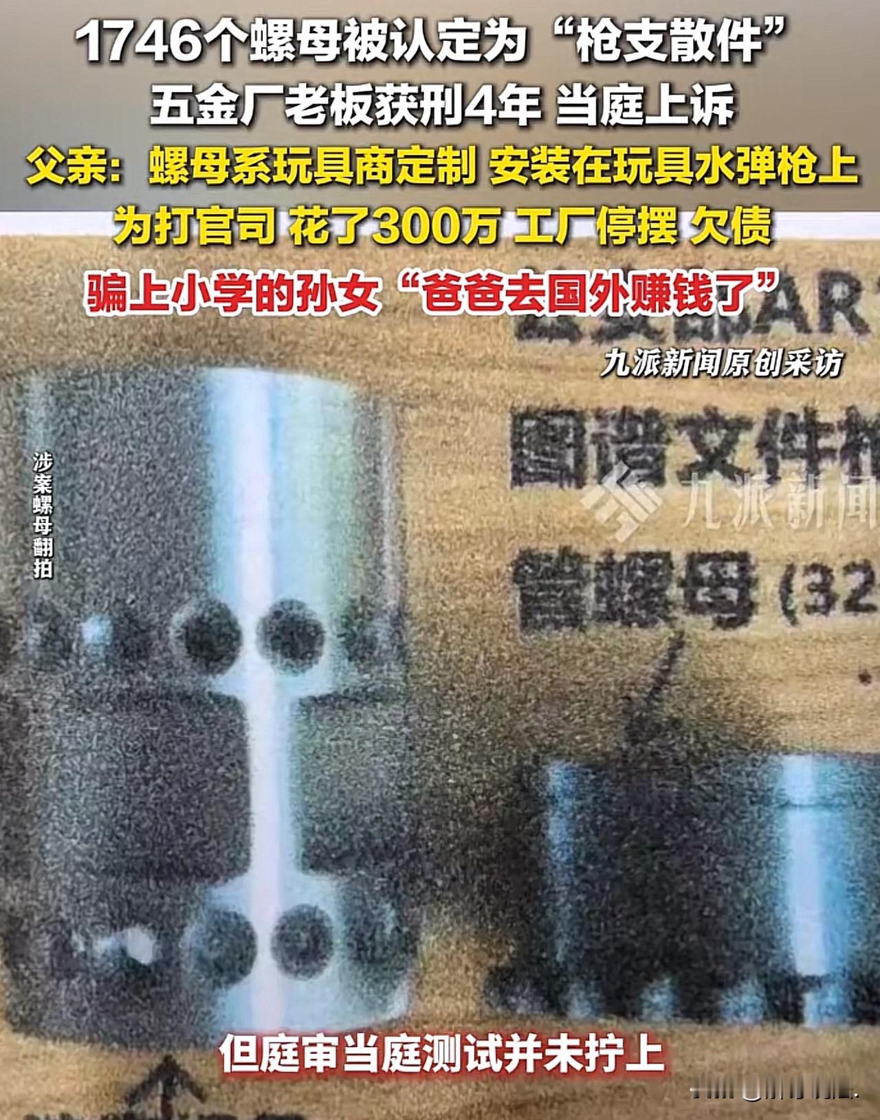 “冤吗?”广东珠海,男子经营一家五金场,一日,民警从天而降,从厂里搜出1746个螺母,这些螺母被认为被认定为枪支散件,男子涉嫌非法制造罪、买卖枪支罪被逮捕,男子大喊冤枉,一口咬定螺母是玩具商定制,用于安装在玩具水枪上。在庭审时,审判长当场拿着涉案螺母往同款螺具上拧,压根就没拧上去,但男子还是被判了4年刑,男子不服,当庭提起上诉,可迟迟没等来二审,男子家为打官司已经花了300多万,工厂已经停工。男子的女儿总是问,爸爸去哪了?家人只能骗他,去国外赚钱了! 老马家的五金厂在通平潮镇的一个村子里经营20多年。 从国营厂改制后自己单干,马建凭着一手好手艺,把小厂子做得有声有色,后来儿子马小强大学毕业回来接班。 青出于蓝而胜于蓝,马小强年轻有魄力,有头脑,对工厂进行了改革,引进了数控设备,让工厂更上一层楼。 谁也没料到,一场突如其来的变故,让马小强陷入了牢狱之灾,整个老马家埋上了一层阴霾。 2022年6月,的一天早晨,还在厂里睡觉,一帮民警从天而降,马建被民警叫醒。 接着,民警二话不说,就开始对厂房里的机器、仓库里的零件被一一清点。 最后,民警带走了1977个他们厂里生产的“铁头子”螺母,连正在青岛出差的儿子马小强也被一并带走。 马建懵了,这些螺母明明是常州玩具商定制的,专门用在玩具水弹枪上,怎么就惊动了警方。 直到后来他才知道,这些螺母被送到了珠海公安做鉴定,结论是“与AR-15步枪枪管螺母结构、尺寸基本一致,可互换”,1977个里竟有1746个被认定为“枪支散件”。 这个结果让马建想不通,自家生产的就是普通五金件,跟真枪八竿子打不着边。 更让他意外的是,2023年7月开庭时,审判长当场拿着涉案螺母往同款螺具上拧,压根就没拧上去,可这样的现场测试,似乎没改变什么。 《刑法》第125条,”规定,非法制造、买卖、运输、邮寄、储存枪支、弹药、爆炸物的,处三年以上十年以下有期徒刑。 最终,法院一审以非法制造、买卖枪支罪,判处马小强有期徒刑四年。 马小强当庭就上诉了,可二审的日子却一等再等,至今没个准信。这两年多里,马家的天像是塌了。 为了给儿子打官司,老两口卖掉了厂里大半设备,花光了所有积蓄,前前后后砸进去三百多万,还欠了一屁股外债。 曾经雇着十几个工人的厂房,如今只剩下三个留守的工人,机器蒙了灰,墙角堆着杂物,再也听不到往日的轰鸣声。 62岁的马建老得特别快,以前乌黑的头发现在白了一多半,血压血糖都控制不住,晚上常常只能睡两三个小时。 他最怕的不是欠债,也不是厂子倒闭,而是面对上小学的孙女。 孩子总缠着问“爸爸去哪儿了”,老两口只能编个谎:“厂里生意不好做,爸爸去国外赚钱了,那边信号差,没法打电话视频。” 每次说这话,马建都不敢看孙女的眼睛,怕一不留神就掉眼泪。 孙女拿着电话手表想给爸爸发消息,他只能赶紧岔开话题,说“写信要等一年才能收到”。 其实马建心里跟明镜似的,儿子生产这些螺母时,完全是按玩具商给的参数来的,而且当地派出所之前下发过AR-15枪支零部件图谱,里面根本没有这种螺母,他们一直是合规经营。 辩护律师也找了西南政法大学做鉴定,结论是这只是枪械的辅助配件,不是主要零部件,可法院没采纳这个意见。 如今的马建,每天除了勉强维持厂子的基本运转,就是到处奔走打听二审的消息,手机里存满了和案件相关的资料。 他说自己现在就一个念想:等儿子出来,父子俩再一起把厂子重新建起来,把欠的债还上,给孙女一个完整的家。 这个春节,注定又是一个团圆不了的年,可老马头心里还憋着一股劲,他相信法律会给儿子一个公正的说法,那些小小的螺母,不该毁掉一个踏踏实实的家庭。 此事曝光后,网友炸了:吓死我了,原子弹用的电线和我家的电线都是用铜做的,这辈子完了。 这么说任意生产钢管的厂都得刑事,因为钢管也能改成枪支、甚至炮! 对此,您怎么看呢,欢迎评论区留言。