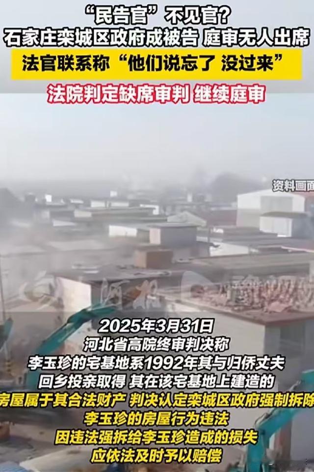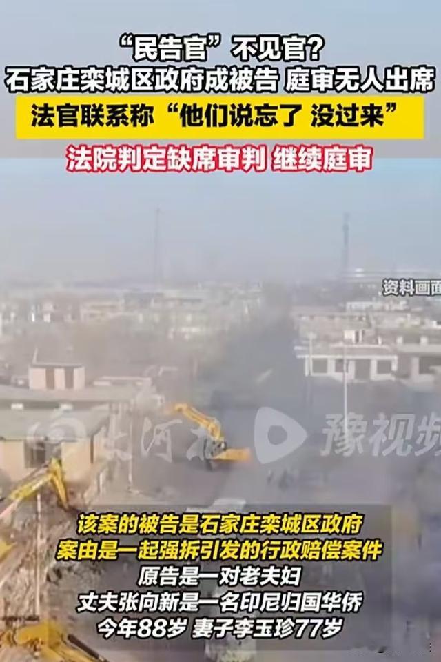 河北石家庄,80多岁归国华侨遇到征地,房子被强行拆除了,老人将区 政 府告了,一审判决后,对方赔偿老人38万余元,老人觉得太少再次上诉,谁知二审对方直接缺席。审判 长当庭联系对方,对方轻描淡写说了句:忘了! 据豫视频报道,张向新老人和妻子是归国华侨。 1992年,54岁的张向新老人和44岁的妻子决定回国,二人回乡后,投奔到了石家庄的亲戚家里。 但是,当时家家户户都有几个孩子,谁家都不宽敞,一直和亲戚住一起也不是个办法。 这时候,栾城区楼底镇楼底村出来表态,说张向新老人的妻子李玉珍符合规定,可以给他们分一块宅基地。 张向新老人和妻子房子的问题终于解决了,夫妻俩后来找人在宅基地上盖了房。 转眼就是几十年过去了,本地城市扩建要征地,张向新老人的房子正好划入了征地范围。 2023年9月11日,张向新的房子被强拆了,两位老人失去落脚的地方非常愤怒,李玉珍女士起诉了当地区 政府。 《行政强制法》规定,行政机关实施行政强制执行行为前,应当以书面形式催告当事人履行义务,并给予当事人陈述和申辩的权利。作出强制执行决定前,应当事先进行催告,且催告书应当载明履行义务的期限、方式等事项。 而当地区 政 府在未履行这些法定程序的情况下强拆张向新老人的房子,属于程序违法。 因此,一审认为当地属于违法强拆。 根据《国有土地上房屋征收与补偿条例》规定,实施房屋征收应当先补偿、后搬迁。任何单位和个人不得采取暴力、威胁或者违反规定中断供水、供热、供气、供电和道路通行等非法方式迫使被征收人搬迁。 《土地管理法》也规定,征收土地应当给予公平、合理的补偿,保障被征地农民原有生活水平不降低、长远生计有保障。 一审认为,李玉珍女士的房子属于她和张向新老人的合法财产。 当地在征地过程中,应与二人就补偿等事项达成协议,这种强拆行为损害了老人的合法权益,应赔偿李玉珍女士相应损失。 四个月后,当地区 政 府决定赔偿李玉珍女士38万余元。 李玉珍女士觉得赔偿太少,再次提起上诉。 然而,让人没想到是,庭审当天,两位老人一大早就被颤颤巍巍赶到准备开庭,可被告席上却一直空着。 工作人员联系被告代表人,对方竟然轻飘飘无所谓地说了一句:忘了! 不仅代表人没来,授权律师也没来,也就是说,被告缺席了。 开庭都能忘,这是真忘还是假忘?两位老人非常气愤,但是就算他们不来,该开的庭还是要开。 《行政诉讼法》第五十八条规定,经人民法院传票传唤,原告无正当理由拒不到庭,或者未经法庭许可中途退庭的,可以按照撤诉处理;被告无正当理由拒不到庭,或者未经法庭许可中途退庭的,可以缺席判决。 这是为了保障诉讼程序的正常进行,避免一方当事人故意拖延或逃避诉讼,确保案件能够得到及时处理,维护原告的合法权益。 也就是说,哪怕代表人不到场,依然可以继续审理并作出缺席判决。 那么,对方故意缺席,是否会受到处罚? 《行政诉讼法》中,没有明确规定被告缺席庭审必须给予处罚,但被告这种行为严重违反了诉讼程序和法律规定。 行政机关作为执法主体,更应该严格遵守法律程序,积极参与诉讼。 代表人以“忘了”这样的理由缺席庭审,是对司法程序的不尊重,也是对原告合法权益的漠视!