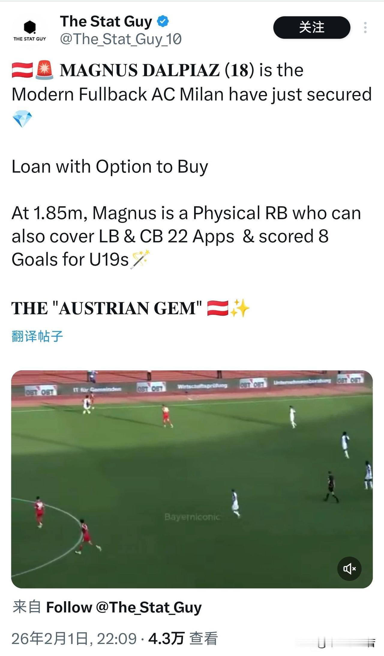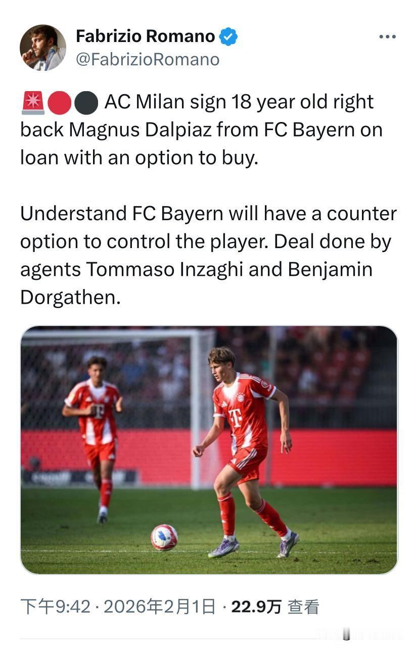 交易完成!马格努斯·达尔皮亚兹完成签约,拜仁慕尼黑18岁右后卫马格努斯·达尔皮亚兹,租借加盟米兰,米兰与拜仁慕尼黑合同包含选择购买条款。拜仁拥有反买断(回购)选项。米兰与拜仁慕尼黑都没有公布具体金额,据说这笔转会属于意外转会,从始至终都是因扎吉的侄子在操作,米兰俱乐部之前并没有购买达尔皮亚兹打算,转会是因扎吉侄子促成的。 马格努斯·达尔皮亚兹是米兰为一线队完成的签约,在谈判期间米兰俱乐部就明确告知球员,他会留在米兰一线队,不会去米兰未来。这个马格努斯·达尔皮亚兹身高185,他可以打右后卫右边中卫与右边翼卫,他的加盟意味着米兰防线与边翼卫不会在有新的补充。 哥们长得有点像年轻时候的海皮亚,他的踢球风格也像,不惧怕对抗,踢的十分硬,他在拜仁慕尼黑一线队训练时候面对老大哥不断放铲,导致一线队很多球员都不敢与他对位。