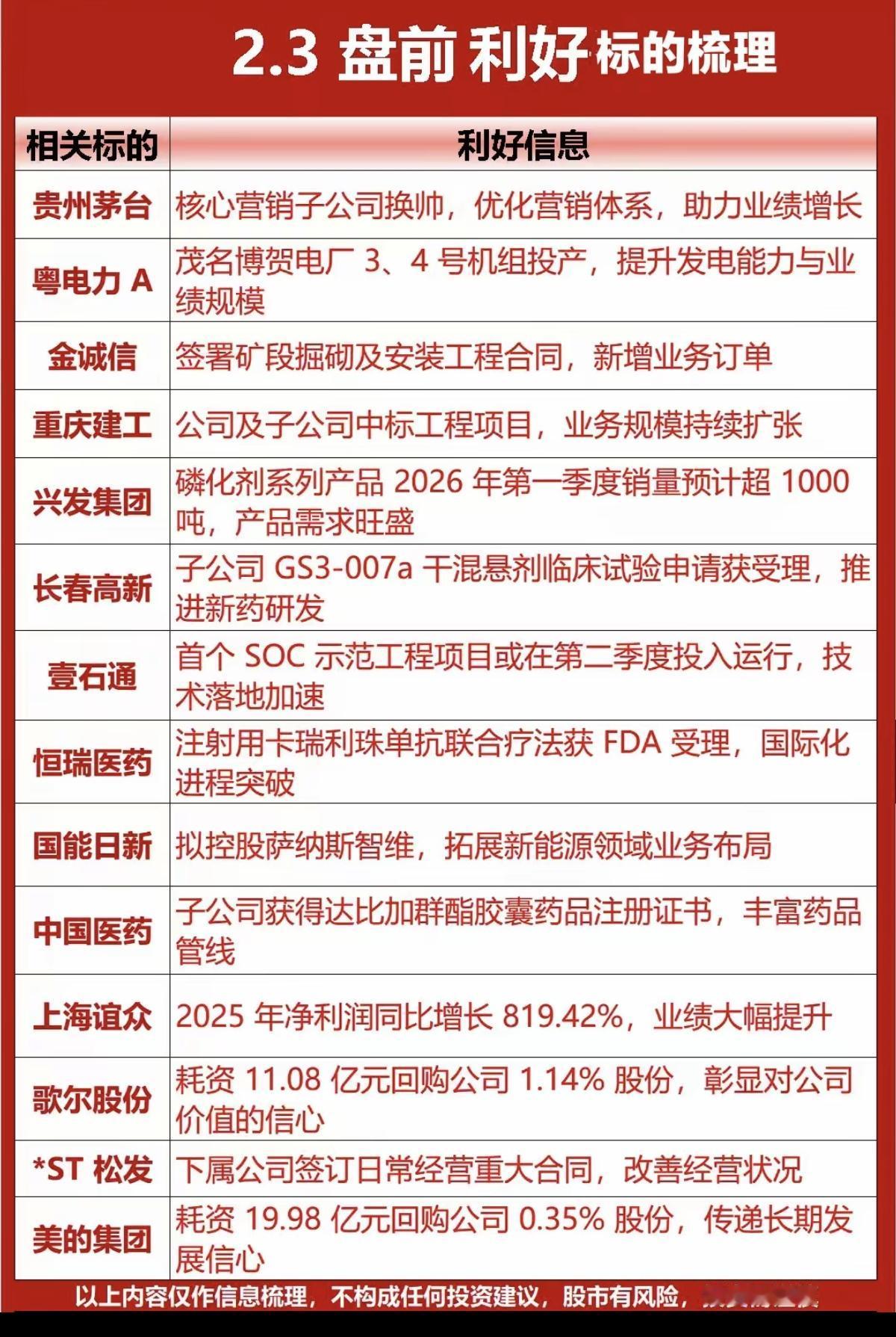 2.3周二 盘前 个股利好公告汇总! 主要涉及:业务增长,新订单,海外业务推进,中标大项目、新技术突破、项目立项、盈利增长等
