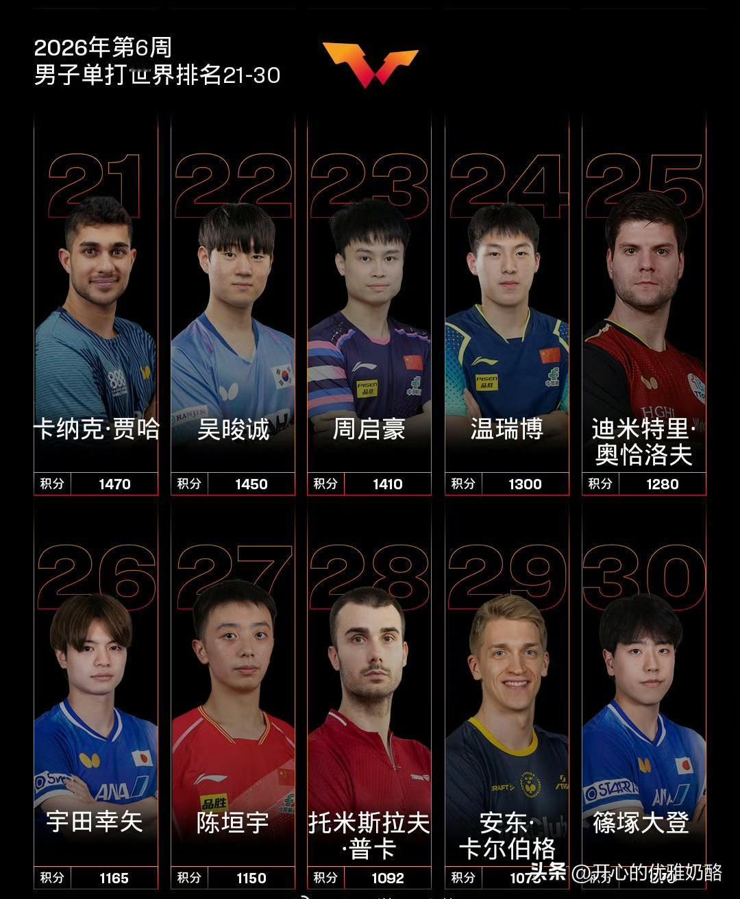 最新男子单打排名,国乒只有7个人名列前30。 当前王楚钦还是稳居榜一,林诗栋暂列第二,估计新加坡大满贯后,很大可能世二不保。 梁靖崑还是第七,缺席亚洲杯和新加坡大满贯二站比赛,松岛辉空和林昀儒很有可能超越,排名估计得十名开外了。 前11到20名只有向鹏一个人,20到30才有周启豪、温瑞博和陈垣宇。 陈俊菘37,黄友政41,薜飞47,徐瑛彬94。 这就是国乒男队当前现状,断档严重,前100名只有11个人。 一月份连轴转打四站比赛,累的够呛积分也没得多少,如此看来小将想打出来很难。 现在男队只能是王楚钦扛大旗,林诗栋和小将们看发挥,想夺冠都会有难度。 只能期待新的教练团队上任,能给国乒带来改变和提高,才能重振国乒雄风。 图片来自网络侵权可删。