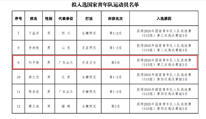 【凭直板长胶打法!#合肥乒乓小将刘子航入选国青队#,母亲喜极而泣:他太淡定了,喜讯都没第一时间告诉我】#母亲回应乒乓小将刘子航入选国青队# 1月21日至26日,由中国乒协主办的“2026年国家青年队入队选拔赛(U15组)”在河北正定国家乒乓球训练基地顺利结束。通过“首轮海选+多轮淘汰赛”的竞赛方式,经过6天共881场比赛的激烈比拼,最终共有12名男运动员和9名女运动员脱颖而出,获得国家青年队的入队资格。其中,安徽籍乒乓小将刘子航以第三次淘汰赛第3名的成绩成功入选国家青年男队。