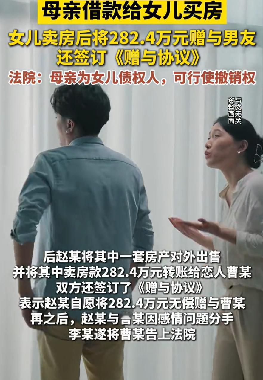 这也太恋爱脑了!安徽合肥,一位阿姨花403万先后给女儿买了一套房子,都登记在女儿的名下,没成想,女儿竟然偷偷卖掉一处,然后将282.4万元的卖房款转给了男友,还签署了自愿赠与书,可最后还是分手了,阿姨得知此事后,瞬间气炸,并起诉了女儿的前男友,要求把钱退回来,法院判了 李阿姨是这位母亲,她拿出自己积攒的400多万元,分两次给女儿买了两套房子,都登记在女儿赵某一人名下。买的时候,女儿也给母亲打了欠条,算是借款买房 没想到,女儿后来私下卖掉了其中一套房,拿到钱后,将282.4万元直接转给了当时的男友曹某。两人还签了一份赠与协议,说这笔钱是赵某自愿无偿赠送给曹某的。可惜好景不长,两人因为感情问题分了手 李阿姨知道这事之后,实在无法接受,自己辛苦攒下的钱,女儿就这么轻易送给了别人,于是将曹某告上了法庭。法院一审、二审下来,最近终于有了结果:支持李阿姨的诉求,撤销那份赠与协议,曹某必须返还282.4万元 法院为什么这么判?核心在于,那两张欠条证明了李阿姨对女儿享有债权,这债权的形成时间早于女儿赠与前男友钱的时间。而女儿在未还清母亲借款的情况下,把大额财产无偿转给别人,已经影响到李阿姨的债权实现。所以,李阿姨作为债权人,有权行使撤销权,把钱追回来 这事表面看是情侣分手后的经济纠纷,但其实有两个很实际的问题 首先,父母出资给子女买房,现在太常见了,但钱怎么给、房产怎么登记、将来万一有变化怎么处理,很多家庭都没细想。像李阿姨这样让女儿打欠条的做法,其实是有法律意识的体现,关键时刻能保住财产。否则,钱一旦给了子女,又被子女转手送人,父母想追回来,难度会大很多 其次,恋爱期间的大额赠与,尤其在没结婚的情况下,风险真的不小。很多人觉得,谈恋爱时给对方花钱、转钱是心甘情愿,甚至认为是“真爱”的证明。但一旦感情生变,这些钱很容易变成扯皮的导火索。像赵某这样,把母亲出资的房款赠给男友,最后分手了,母亲站出来追讨,从法律上是完全站得住脚的。感情可以冲动,但财产处分还是要谨慎 爱情和金钱,永远都需要一点清醒的界限。在感情里可以付出,但别把全副身家、甚至父母的积蓄都押进去。成年人处理财产,既要对自己负责,也要对家人的付出有起码的尊重