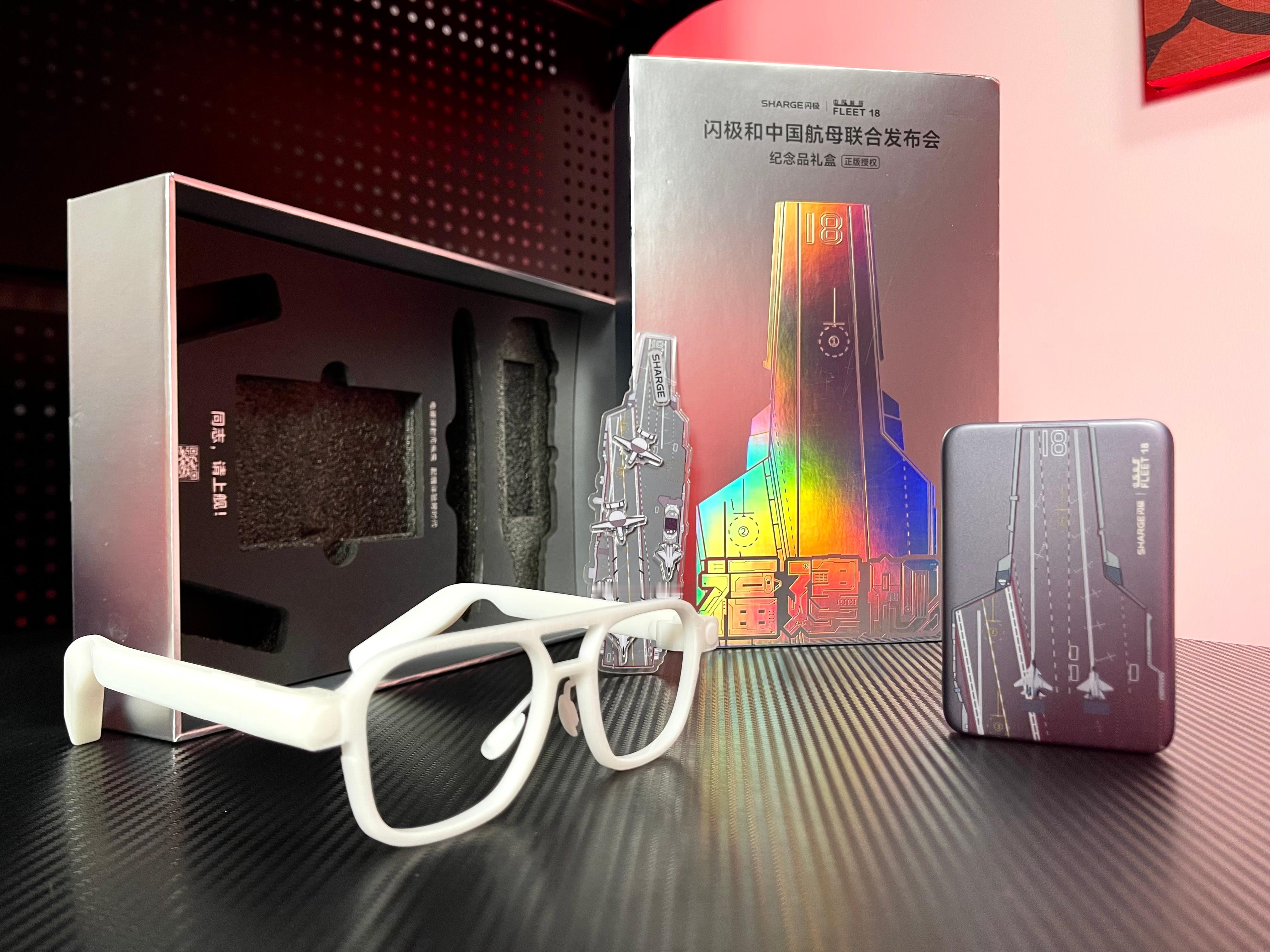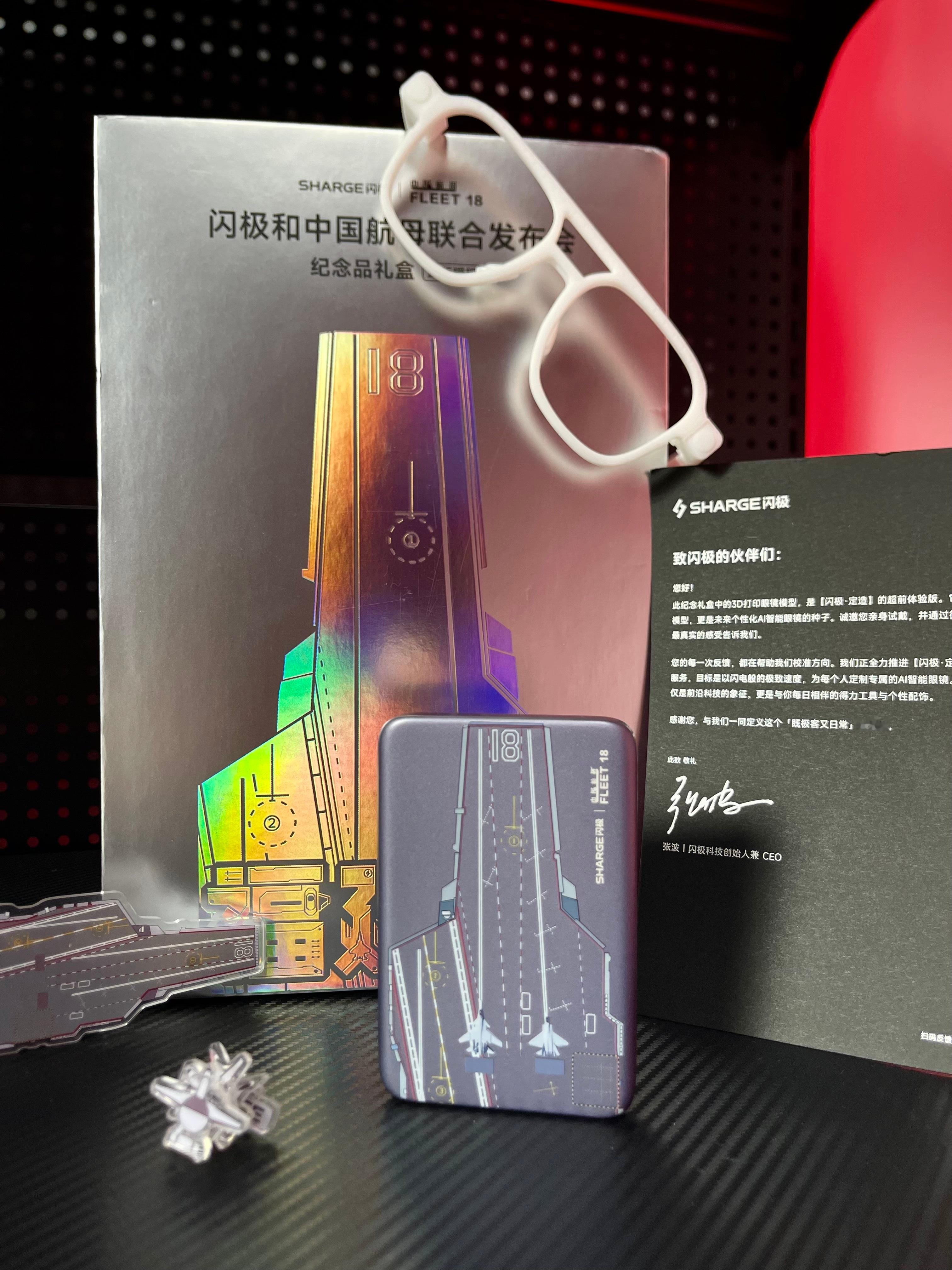 礼盒里的东西更有意思:印着航母甲板的充电宝、福建舰立牌,还有个3D打印的眼镜模型 —— 这可是【闪极・定造】的超前体验版!官方说未来要给每个人定制专属的AI智能眼镜,不仅是科技潮玩,还要变成天天戴的实用工具+个性配饰,这野心我先 respect 了!