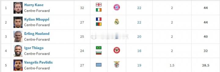 三足鼎立!欧洲金靴:凯恩、姆总同积44分,哈兰德40分第3足球 01月22日讯 德转最新欧洲金靴排名,凯恩与姆巴佩同积44分并列第1,哈兰德40分第3。