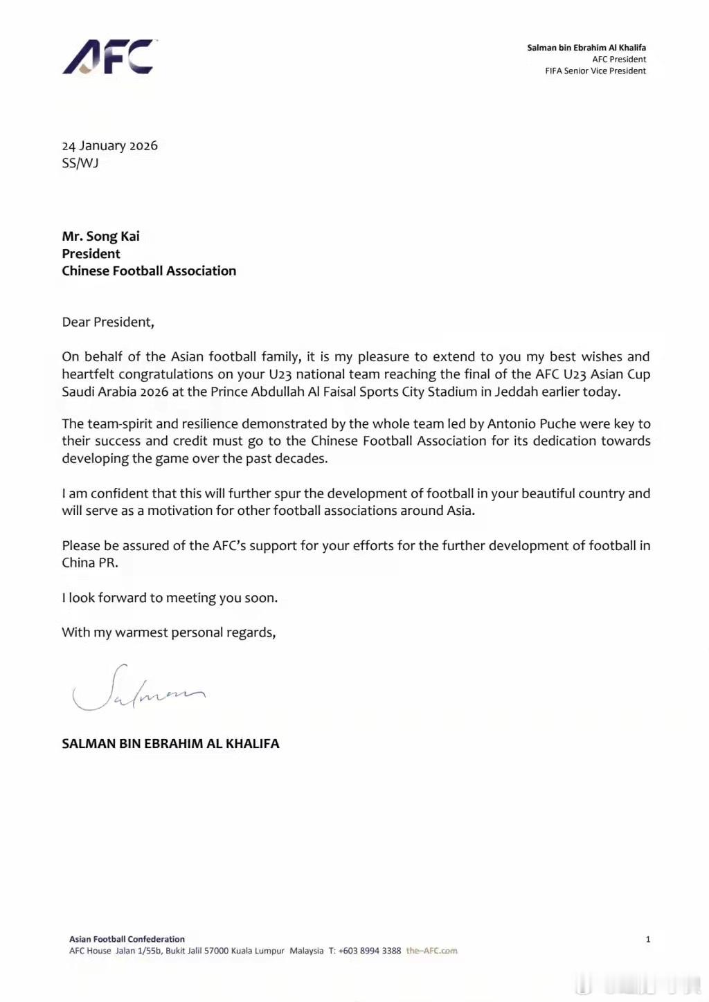 亚足联主席致函中国足协,祝贺中国队获得U23亚洲杯亚军