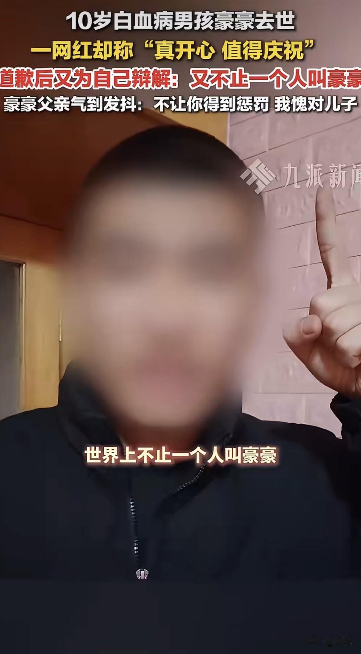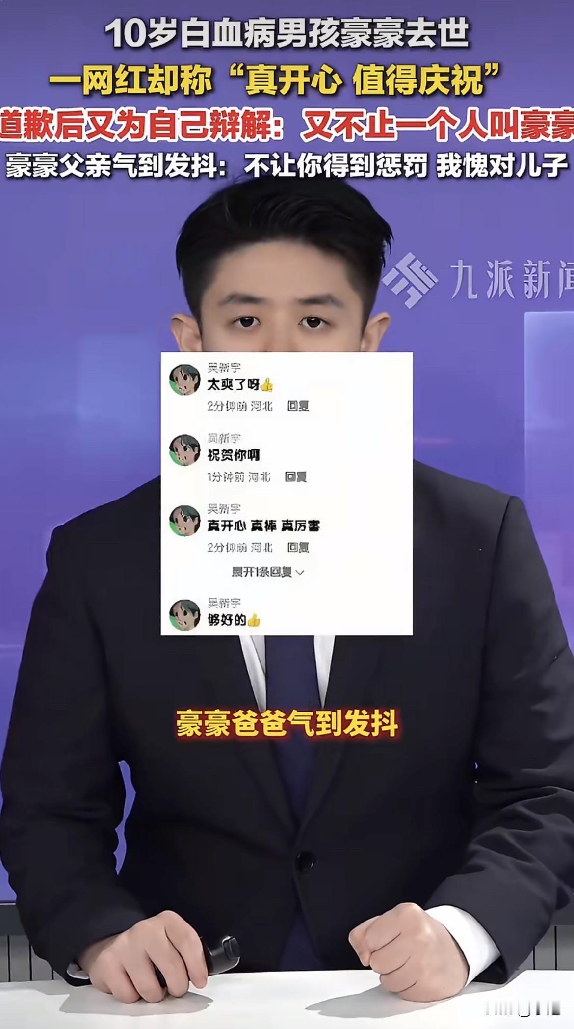 人血馒头,真有人吃得这么香。一个孩子刚走,就有人敲锣打鼓说“恭喜”。 说的就是那个叫豪豪的10岁男孩。他和白血病打了六年仗,自己把苦药叫“小甜点”,疼的时候还笑着录视频,让网友祝他“王子请恢复健康”。几十万人排队留言,给他加油。可1月27号,这个小王子还是走了。 就在大家难过的时候,一个叫“吴新宇”的网红跳了出来。他在豪豪相关的视频下面,直接评论:“祝贺你”、“真开心”。这还没完,他接着自己发视频,翘着二郎腿说风凉话:“他走了跟我有啥关系?又不是我造成的。有人让我送花?凭什么?” 这些话,每一个字都冒着凉气,看不出一点点人心该有的温度。 最扎心的是豪豪爸爸的反应。一个中年男人,对着镜头哭得满脸是泪,手抖得停不住。他说看到那些话,“气到发抖”。这个父亲咬着牙说,要是讨不回公道,他就愧对儿子。你能听出来,这不止是伤心,这是一种被狠狠刺伤后的愤怒和绝望。 事情闹大了,那个网红开始“表演”了。1月30号,他发视频道歉,说“豪豪对不起”。可理由居然是“想蹭热度做节目效果”。更让人无语的是,他紧跟着说:“而且不止我一个人说你,有很多人说你。” 这哪是道歉,这分明是耍赖,是想把水搅浑,显得自己没那么坏。道歉都道得这么不诚恳,还想着拉别人垫背。 没想到,过了两天,他的“剧本”又改了。2月1号,他发新视频,说自己当时说的是另一个得白血病的“豪豪”,还反问道:“世界上不止一个人叫豪豪。” 从“蹭热度”到“认错人”,两次说法完全对不上。如果真是另一个孩子,他第一次道的哪门子歉?这种前后矛盾的辩解,只能说明他根本没觉得自己错,只是在找各种借口,试探大家的底线。 很多人去问平台,这事管不管。2月2号,平台客服的回应是,如果视频删了,他们“无法查证”。这话听起来挺没力的。难道在网上,只要手脚快,把坏话一删,就能当什么都没说过?那个网红的账号到现在还能用,他简介里“我要当网红”几个字,现在看特别刺眼。是不是为了红,什么底线都能不要了? 整件事,就像两个极端的世界撞在了一起。一边是孩子用尽最后力气,想要留住一点童话的光,说着“王子请恢复健康”。另一边,是一个成年人为了那点可怜的流量,毫不犹豫地吹灭这束光,还说“真开心”。这种对比,残酷得让人说不出话。 这件事里,你觉得哪个部分最让人心寒?是那句冰冷的“恭喜”,是道歉时还要“拉人下水”的算计,还是那种“删了就没发生”的无力感?