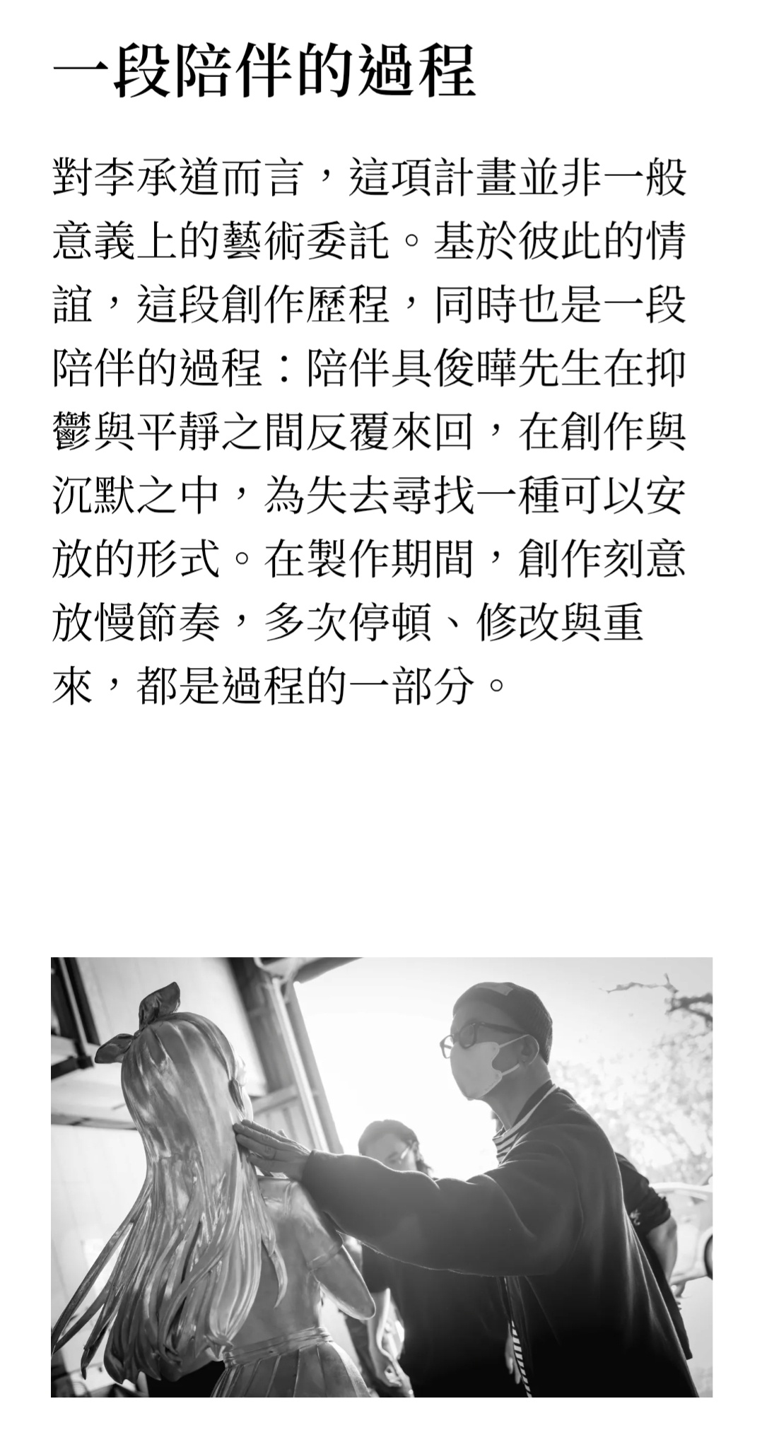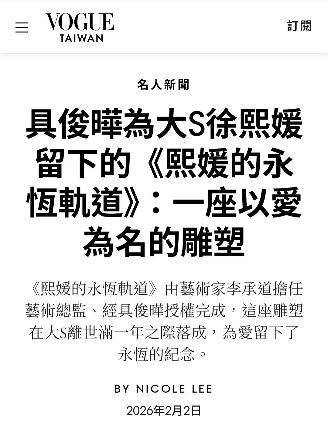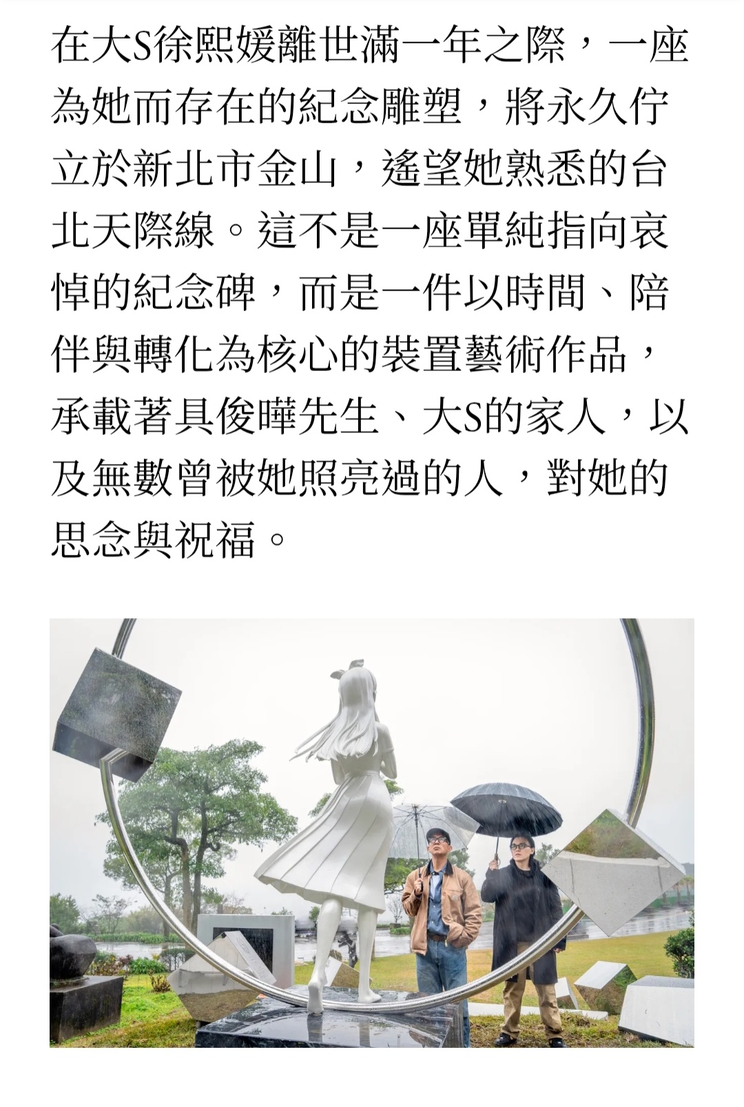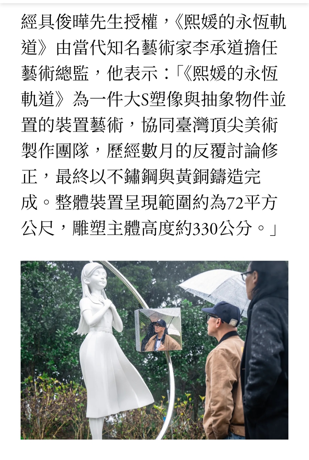 大S纪念雕像艺术总监李承道说:「这座雕塑并不追求写实,而是透过空间与结构,让思念本身成为作品。这不是为了重现熙媛的样貌,而是为她留下的精神找到一个可以停留的地方。作品并不指向悲伤的终点,而更像是一个开放的入口:让思念得以停留,让祝福可以持续流动。在这条轨道上,时间不再终结,爱仍持续运转。」