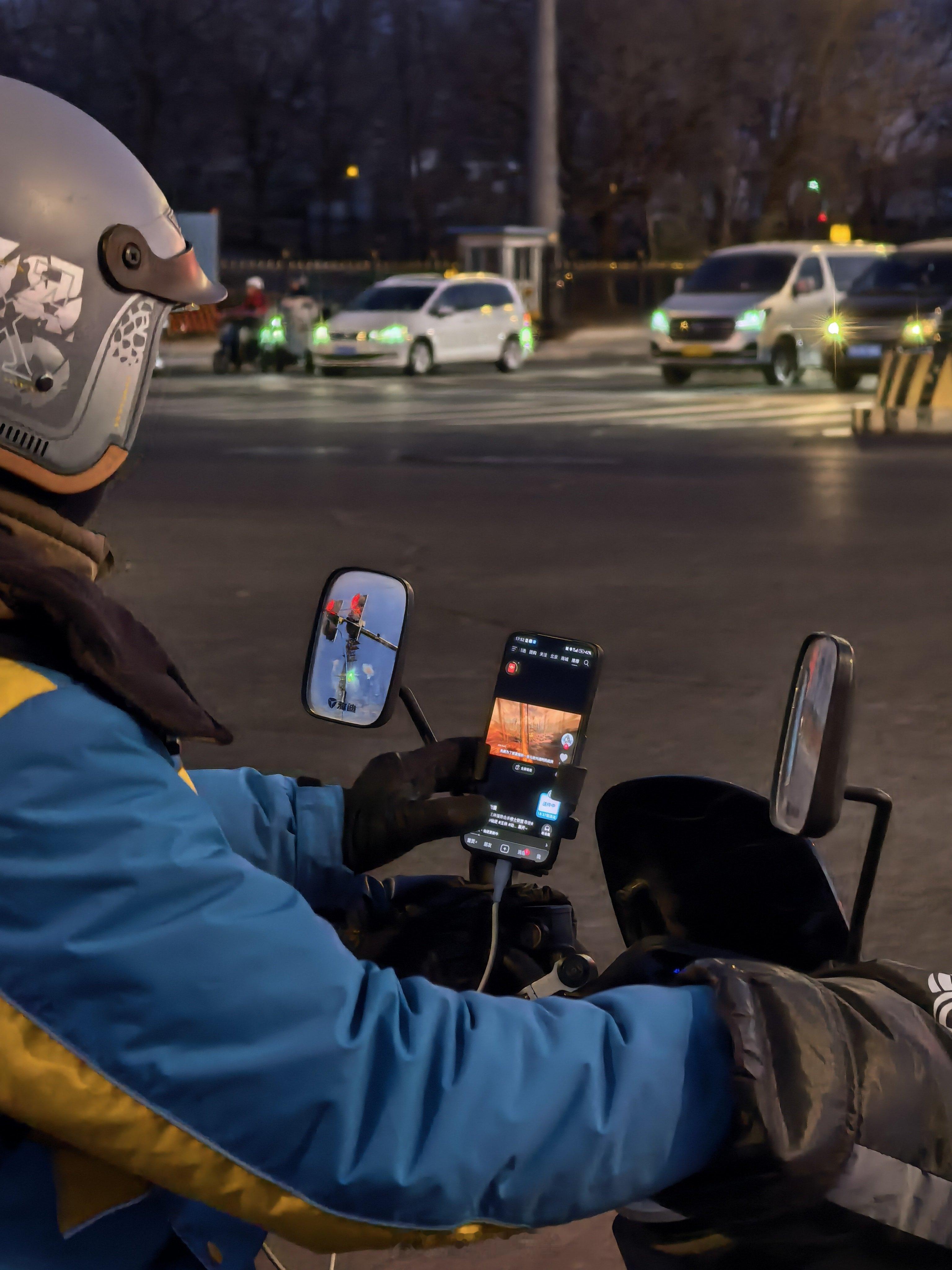 外卖小哥的手机支架,我以为是导航用的。没想到是在看短视频。挺危险的。