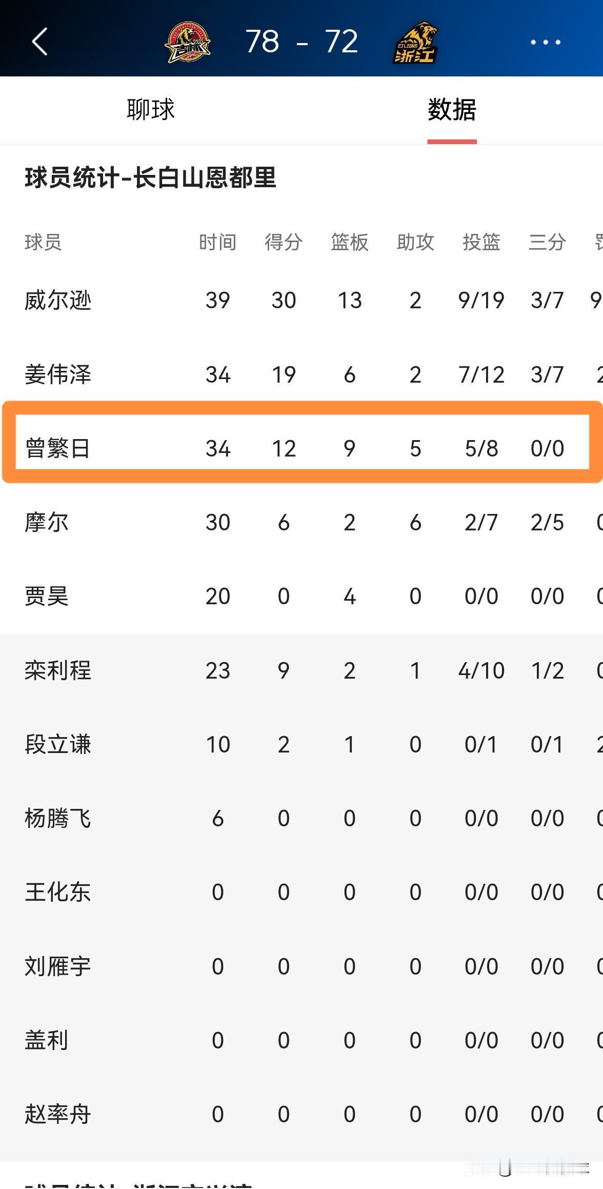 我忍不住要怒赞长白山恩都里大将曾繁日!在今天长白山恩都里主场以78:72击败浙江方兴渡的比赛中,曾繁日在攻防两端都打出了无可挑剔的表现,他真的是功不可没。 全场比赛下来,曾繁日首发出战34分钟,投篮8中5,其中罚球2中2非常高效的砍下12分,还有9篮板5助攻1抢断2盖帽,他的场上正负值为+7。 尤其是在第四节比赛的最后时刻,曾繁日先是抢到进攻篮板上篮得手,随后曾繁日又在防守端完成了对布朗的抢断,这一攻一防真是价值千金。