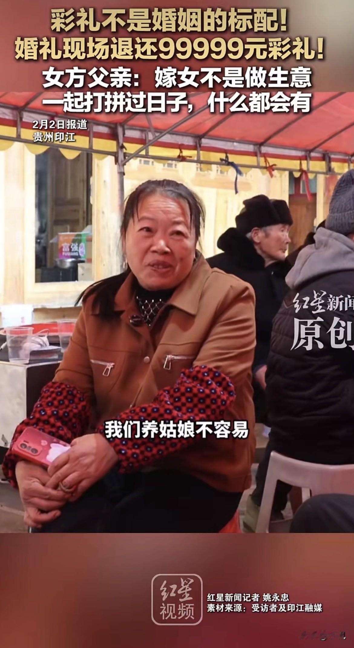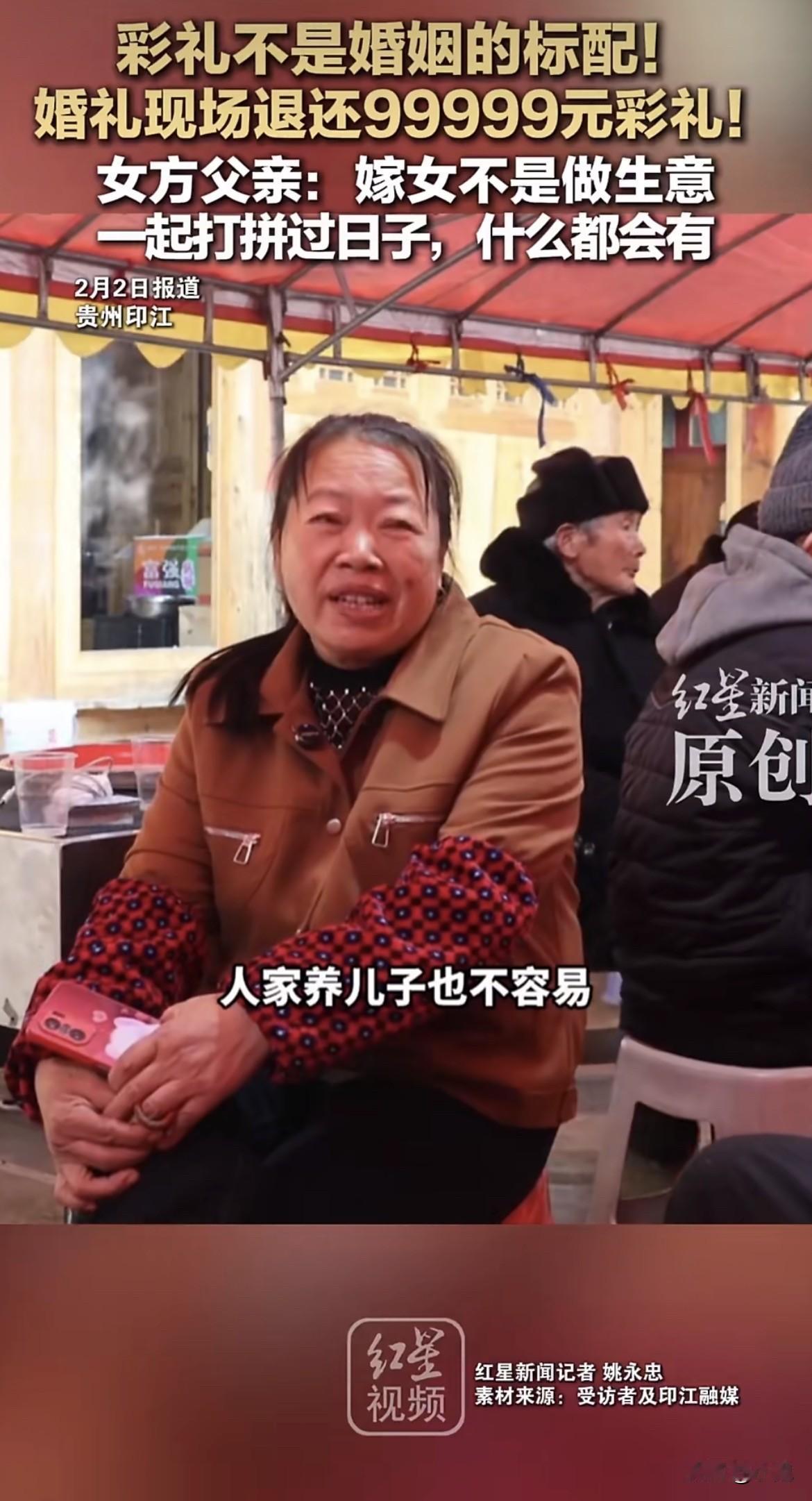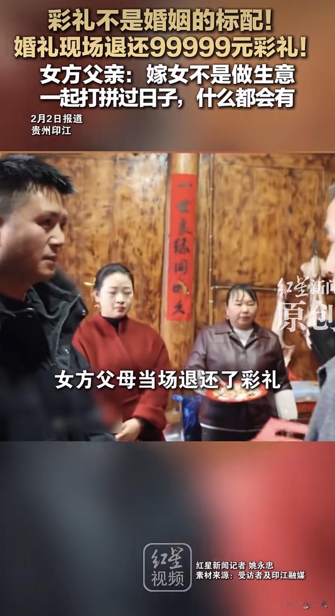 婚礼现场岳父反手一个“回手掏”,近十万彩礼当场退回女婿口袋。 在贵州印江的一场婚礼上,新郎李茂森自己准备了99999元,取个“久久久久久”的好意头,还特意加了1块钱“裱”起来,礼数做得很足。他心里估摸着这关怎么也得过。可谁能想到,仪式上岳父陈学钊接过那个大红礼盒,摸了摸,转手又稳稳地塞回他怀里。小伙子当时脑子有点空,紧接着心里头就涌上一股热乎劲儿,除了感动不知道说啥好。 其实新娘陈连芳对这场面一点不意外。因为她姐几年前出嫁,爸妈也是这么干的,彩礼原封不动退回去。所以她结婚前就跟老公打过招呼:“你看着办,反正我爸肯定要退。” 她爸陈学钊是个地道农民,话不多,但心里有杆秤。他总说“女儿嫁出去,是希望女儿吃上饭,而不是做生意”。这话有来由。他自己结婚那会儿,真是一无所有,但岳父岳母没为难他,就看中他这个人实在。这份情,他记了大半辈子。现在自己当岳父了,他说得更直白:“作为父母,没有能力去帮助(女儿),但至少不能给压力。” 他说的压力,就是怕亲家为了凑彩礼去借钱,这债兜兜转转,最后还得小两口来扛。 这家人做事,不是光退一步就完了,还进一步。退了小十万的彩礼,转头又给女儿准备了嫁妆,加上按当地“压箱底”风俗给的“启动资金”,总共值六万块钱。这一退一给,意思再明白不过:我们不是要你的钱,我们是真心实意盼着你们这个小家能起步,能过好。 新娘妈妈李正平的话更接地气,她讲:“养女儿不易,养儿子也不易,开亲就是一家。” 她觉得,婚姻是两个人合伙过日子,不是买卖。 村里干部也说了,这家人是实实在在的榜样。其实他们当地早就提倡“零彩礼”或者彩礼不超过六万。陈学钊家不仅做到了,还做得特别彻底,两次嫁女,次次如此。来喝喜酒的乡亲们私下都议论,说这家人做事“通透”,给儿女减了负,也给心里松了绑。 一场婚礼,像一面镜子,照出了一家人的处事和心肠。父亲话不多,但担当沉甸甸的;母亲道理普通,但智慧都在里头。他们没留下彩礼,却给了女儿女婿一份更厚重的“启动资金”——那是一份体谅,一份祝福,还有一个关于“家和万事兴”的最朴素的理。 对这个事你怎么看?如果你是当事人,会怎么处理彩礼这道题?
