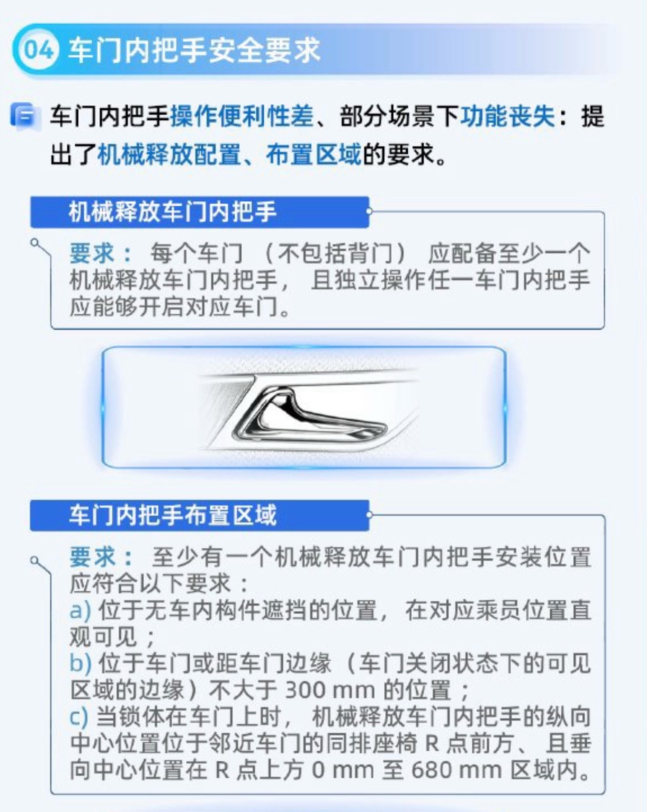 汽车门把手安全强制性国家标准发布 汽车门把手安全,强制性国家标准发布!2027年1月1日执行,还有不到一年的改进时间。对于车内外门把手 电子开关、机械开关、场景要求、门把手车内外位置给予了明确规定。摘俩重点!有不少车要改进了。1、车外门把手 要有不借助任何工具可以打开的机械打开模式。2、车内的紧急机械门拉手,位置不可以有任何遮挡。非常科学的标准。大家来说说你见过的很不科学的门把手体验。