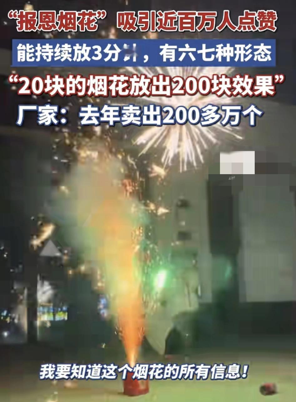 江西一位网友发布的一段烟花视频获得了80万人的点赞。我有成20块钱买的烟花放出了200块钱的感觉,因为在整个过程中,烟花变换了六七种不同的形态一共持续了三分钟,网友在线纷纷询问烟花的名字。有网友特意搜出了烟花的品牌,老板称这款烟花一直都是主打三分钟,销量已经达到了200多万。