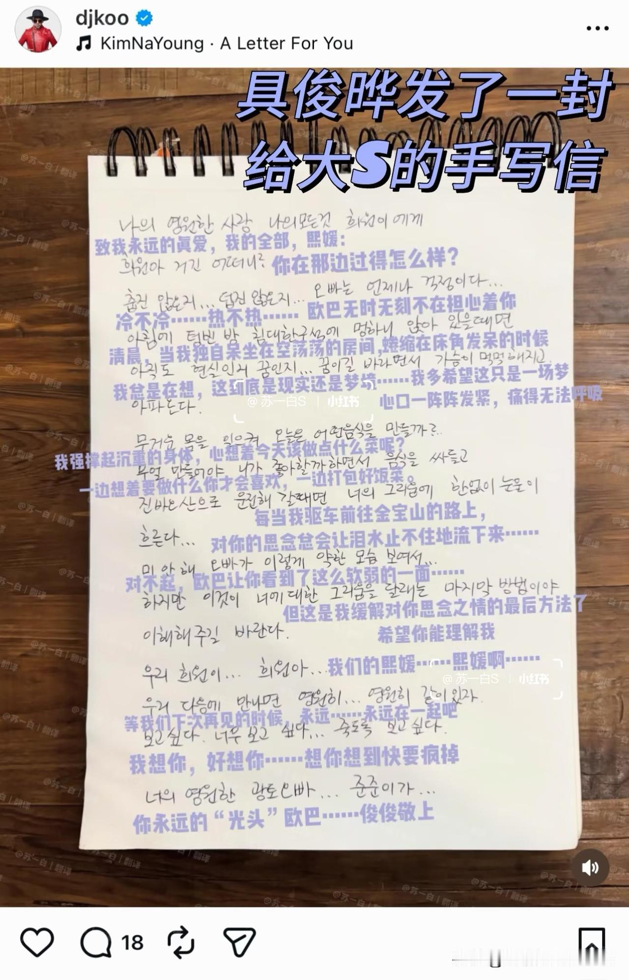 看到具俊晔揭开大S雕像我没哭, 看到S妈抱着雕像痛哭我也没哭, 直到看到具俊晔给大S的手写信, 我竟忍不住湿了眼眶…… 那句“等我们下次再见的时候,永远……永远在一起吧!”他一定是真的爱过,也是真心难过,所以他很痛苦很愧疚,可能觉得那时候没有拼尽全力去抢救,谁会想到,那是最后一次见面,一别便是永别。 看到网友写的一段话——“也许熙媛最后三年与欧巴的相遇是老天对她一生善良仗义的补偿,所以她毫不犹豫一天都不敢耽误的奔赴!” 若我代入具俊晔的角色,宁愿没有遇到这样一个人,也不想经历这种心痛。三年相守时间太短,他需要用一生来思念! 大s具俊晔