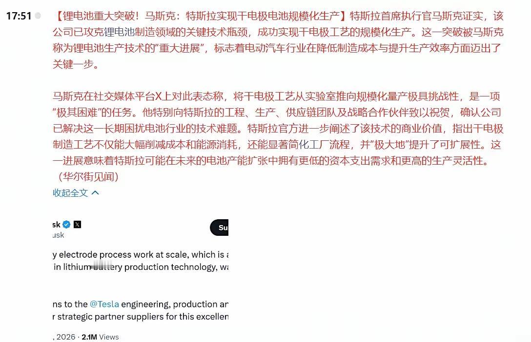重大利好!A股这条炒作路线要火? 2月2日盘后,马斯克在社交媒体平台X上宣布特斯拉实现了干电极电池规模化生产。这一消息犹如一颗重磅炸弹,瞬间在资本市场激起千层浪。随后特斯拉公司也确认了此事,无疑让这个利好更加板上钉钉。 干电极电池规模化生产,那可是意义非凡。要知道,固态电池商业化一直面临两座大山,“固 - 固界面”问题和高昂的成本,让众多企业望而却步。而干法电极技术,恰恰是能同时推翻这两座大山的最优路径之一。如今特斯拉成功攻破这个难题,就像是为固态电池的商业化之路打通了任督二脉,也难怪马斯克会专门公开祝贺,这确实是锂电池生产领域的一个重大里程碑。 对于A股市场来说,这无疑是一个重要信号。“马年跟老马”,跟着马斯克的风向走,在A股已经逐渐形成了一种共识。每次特斯拉有重大技术突破或者业务进展,A股相关板块总会有所反应。这次干电极电池规模化生产,很可能会带动一系列相关板块的炒作。 首先,受益最直接的就是锂电产业链上游的材料企业。像璞泰来,作为锂电材料龙头,其布局的干电极专用粘结剂与复合铜箔,技术深度适配特斯拉需求,订单增长有望进一步提速。还有天奈科技,作为碳纳米管导电剂全球龙头,产品能提升干电极工艺的导电效率,业绩弹性值得期待。 其次,锂电设备企业也会迎来机遇。先导智能作为锂电设备核心企业,提供干电极涂布与成型设备,随着特斯拉产能扩张,订单量可能会大幅增加。赢合科技布局了干电极产线整线装备,也将受益于这一技术突破带来的产能扩张需求。 再者,电池端的企业也不容忽视。宁德时代、比亚迪等动力电池龙头,本身就储备了干电极技术并在推进量产,特斯拉的这一突破,会加速整个行业的技术升级,它们凭借强大的供应链协同能力,也将从中受益。 不过,虽然特斯拉干电极电池规模化生产是重大利好,但A股市场向来复杂多变,影响股价的因素众多,也不能仅仅因为这一消息就盲目乐观。市场情绪、资金流向等都会对相关板块和个股的表现产生影响。而且,部分个股可能会在利好消息公布后出现短期的炒作过热,随后面临回调风险。 总的来说,特斯拉干电极电池规模化生产为A股市场带来了明确的炒作线索,锂电产业链相关板块有望成为近期市场的热点。但投资者在参与时,还是要保持理性,关注企业的基本面和技术实力,选择真正受益于这一技术突破、有业绩支撑的标的,避免陷入纯题材炒作的陷阱。明天A股具体会如何演绎,让我们拭目以待。