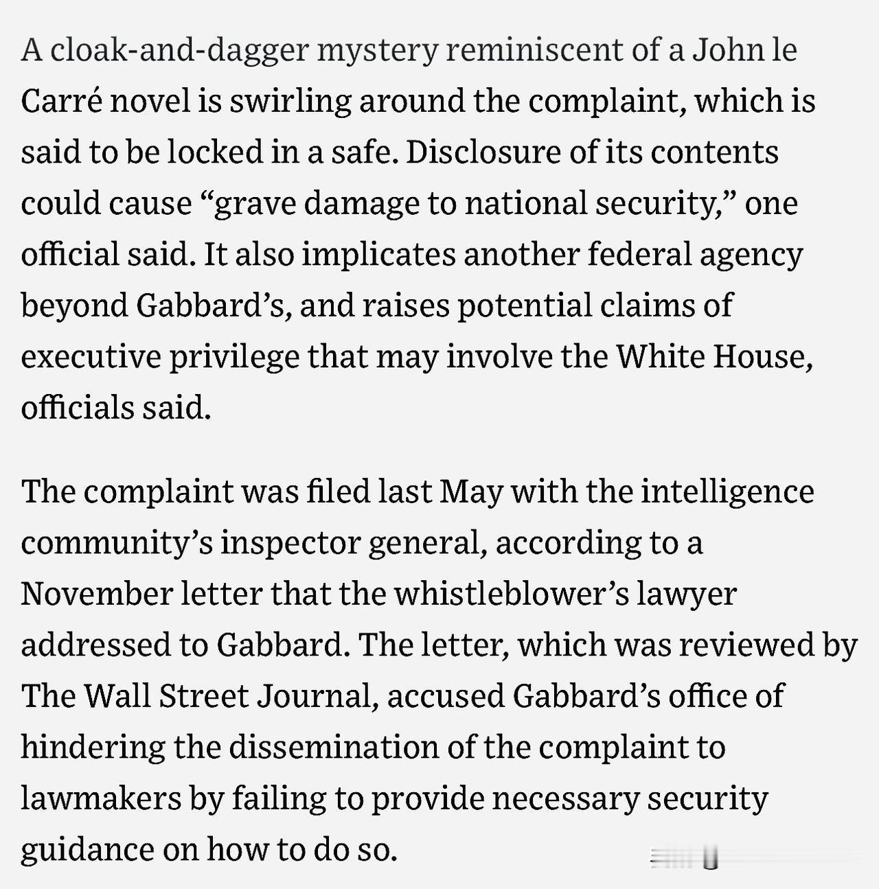 突发炸裂新闻:据《华尔街日报》报道,一名美国官员提交了一份爆炸性投诉,指控美国首席情报总监图尔西·加巴德犯有严重不当行为,这些投诉内容极其爆炸性且高度机密,引发了数月的幕后混乱,争论国会是否应该(或如何)查看这些投诉。 媒体都在问:“到底发生了什么?” 另有类似报道:一名举报人于5月对图尔西·加巴德和另一未具名的政府部门提交的爆炸性投诉遭到阻挠,尽管举报人的律师做出了努力,但该投诉仍未按规定提交给国会。