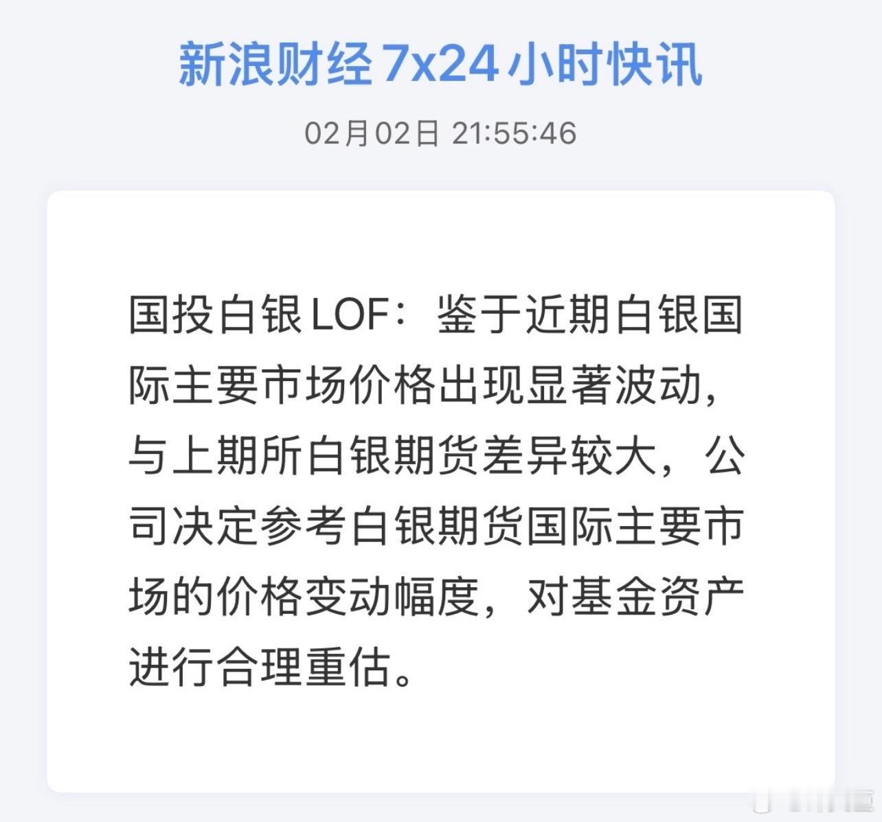 国投白银LOF:鉴于近期白银国际主要市场价格出现显著波动,与上期所白银期货差异较大,公司决定参考白银期货国际主要市场的价格变动幅度,对基金资产进行合理重估。a股行情基金白银
