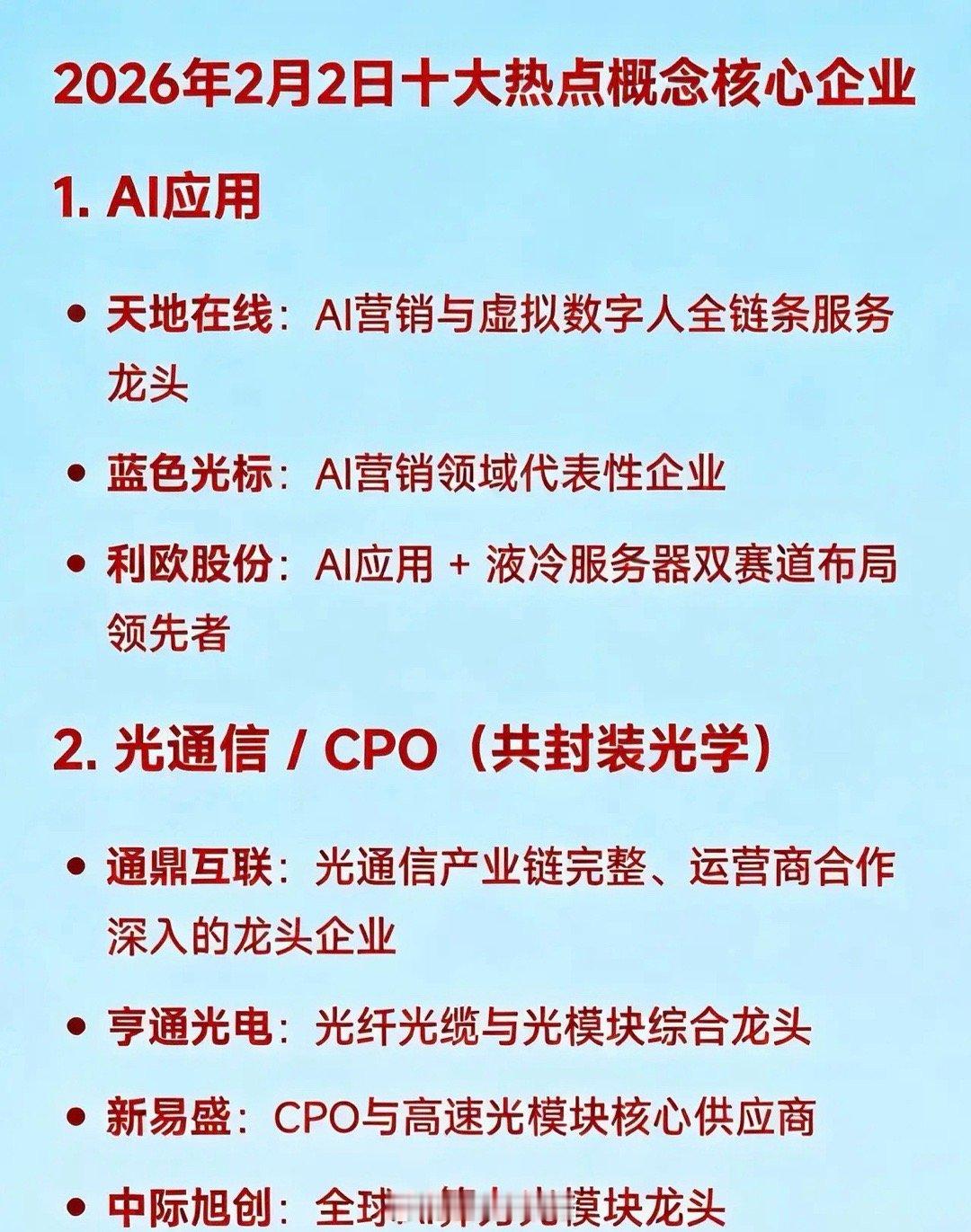 2026年2月2日十大热点概念及核心企业梳理1.AI应用•天地在线:AI营销