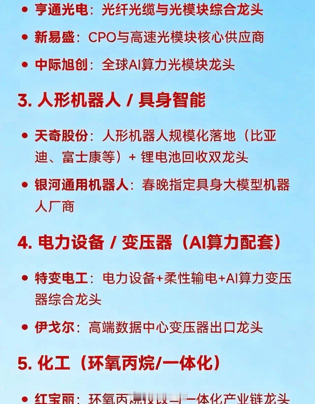• 新易盛:CPO与高速光模块核心供应商,产品适配AI算力场景,订单增长确定性强。