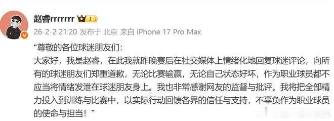 “大家好,我是赵睿,在此我就昨晚赛后在社交媒体上情绪化地回复球迷评论,向所有的球迷朋友们郑重道歉,无论比赛输赢,无论自己状态好坏,作为职业球员都不应当将情绪发泄在球迷朋友身上。我也非常感谢网友的监督与批评。我将把全部精力投入到训练与比赛中,以实际行动回馈各界的信任与支持,不辜负作为职业球员的使命与担当!”