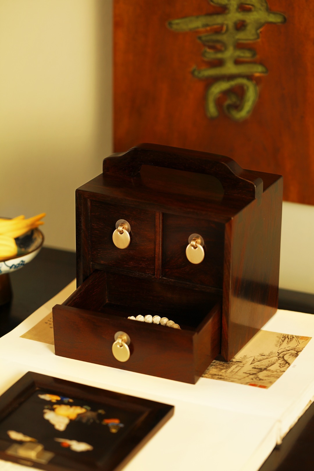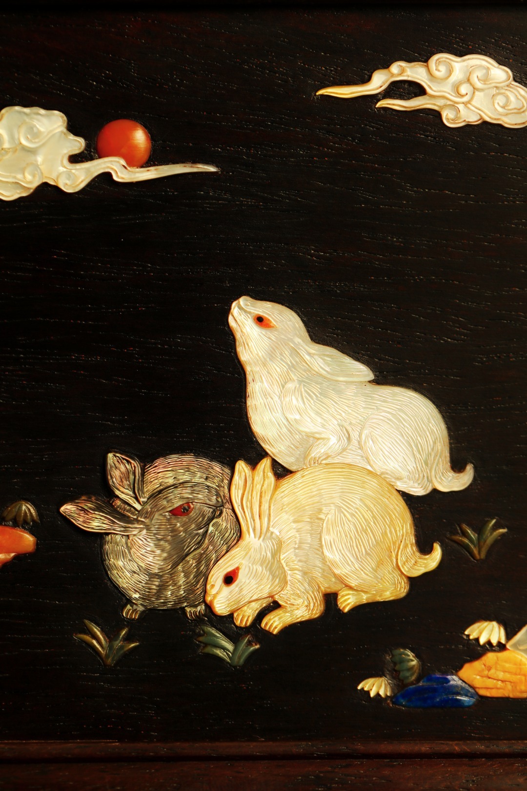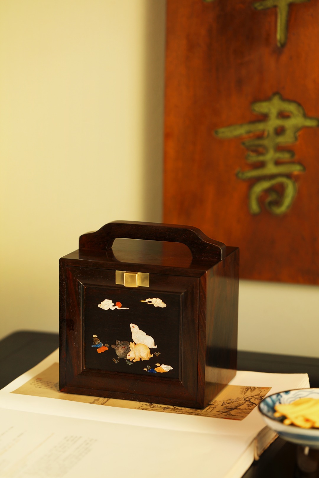 百宝嵌三只兔子,灵动呈现。画面于珍贵宝石、螺钿等拼就,每一处镶嵌细腻入微,宝石的光泽赋予兔子神韵,螺钿的纹理恰似灵动身姿。提梁趁手,内设多格,收纳雅物珍玩,古韵十分。