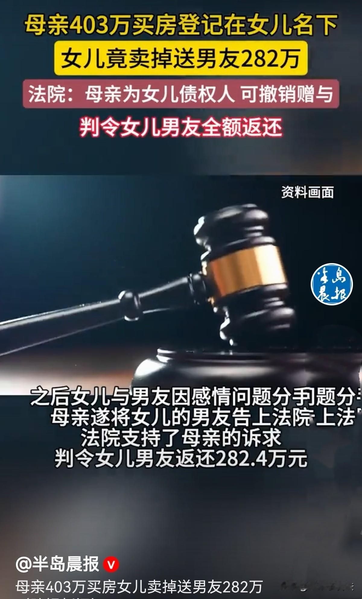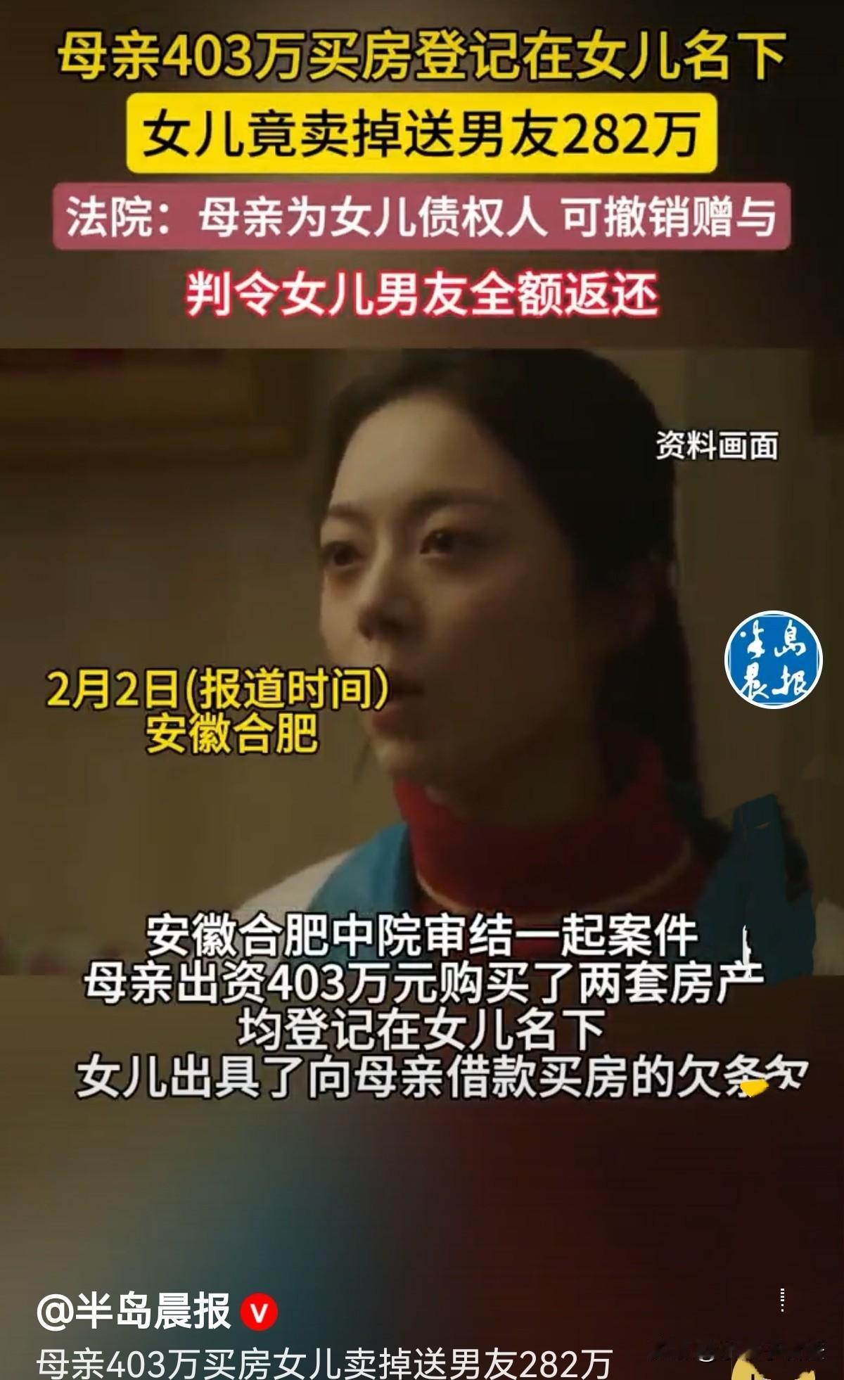 “骨灰级恋爱脑!”安徽合肥,母亲拿出403万买了2套房,房产证均写女儿的名字,女儿为母亲写了借款欠条。在母亲心里她是真心爱女儿,借条只是形式而已。没想到女儿恋爱脑,竟偷偷卖掉一套房,将卖房款282.4万转给男友,并签了《赠与协议》,谁知男友拿到钱后与她分手。母亲怒将女儿男友告上法庭,要求退还卖房款。法院判决亮了! 李某就赵某一个女儿,看着女儿长成亭亭玉立的大姑娘,她由衷的欣慰,更为她的深远谋划。 2020年,李某拿出毕生积蓄403万,买了2套房,全都写在了女儿名下。只希望在她的扶助下,女儿的生活没有压力,过得更好。 掏钱的时候,李某没多想,就想着给女儿留个保障,可女儿主动写了两张欠条,清清楚楚写着“今借母亲李某403万元用于购房,后续归还”。 李某看着欠条,心里又暖又踏实,觉得女儿长大了,懂得体谅自己的辛苦,但她自己知道,她不会让女儿还钱! 赵某遇到了曹某,两人一见钟情谈起了恋爱,曹某嘴巴甜会来事,把赵某哄的如在蜜罐。 李某也被他阿姨长阿姨短,哄得挺开心,李某也真心觉得,只要对女儿好,女儿幸福,她的付出就值得! 可她万万没想到,这份沉甸甸的母爱,最后会被女儿用来“讨好”男友。 相处了一年多,赵某越来越离不开曹某,总想着做点什么证明自己的真心。 2022年夏天,她突然冒出个念头:把其中一套房子卖了,给男友一笔钱,让他创业。 她没跟母亲商量,偷偷联系了中介,以市场价把房子282.4万卖了出去。 拿到卖房款,她觉得自己特别伟大,在她眼里,这是对爱情的“投资”,只要能和曹某好好走下去,这点钱不算什么。 没过多久,赵某就把卖房款里的282.4万元转到了曹某账户,还主动和他签了一份《赠与协议》,白纸黑字写着“自愿无偿赠与”。 曹某收到钱心里却乐开了花,不仅没拒绝,还拿着这笔钱换了新车、买了奢侈品。 赵某看着男友开心的样子,越发觉得自己做对了,完全没意识到,她处分的不仅是一套房子,更是母亲半生的心血。 2023年初,曹某和赵某的爱情发生了质的变化,他因生活琐事频繁吵架,矛盾越来越深,最后闹到了分手的地步。 曾经海誓山盟的恋人变成陌生人,赵某伤心欲绝,可更让她崩溃的是,母亲李某偶然间发现了房子被卖掉的事。 李某想帮女儿打理一下房产手续,却发现其中一套房子的产权已经变更,追问之下,赵某才支支吾吾说出了实情。 李某听完当场就懵了,眼泪止不住地流:“那是我一辈子的积蓄啊!我给你买房是让你有个退路,你怎么能一声不吭就卖了送外人? 她又气又心疼,气女儿的糊涂,疼自己的血汗钱打了水漂。 冷静下来后,李某觉得不能就这么算了,2023年下半年,李某一纸诉状将曹某告上了法庭,要求撤销赠与协议,追回282.4万元。 庭审时,曹某还在辩解,说这笔钱是赵某自愿赠与的,并且签了赠与协议,合同生效。自己没有过错。 但法院审理后认为,赵某出具的欠条具备借款合同的全部特征,李某对赵某的403万债权合法有效,而且形成时间早于赠与行为。 赵某无偿转让财产给曹某,导致自己无力偿还母亲的借款,损害了债权人的合法权益,符合撤销权的行使条件。 《民法典》第538条规定:债务人以放弃其债权、放弃债权担保、无偿转让财产等方式无偿处分财产权益,或者恶意延长其到期债权的履行期限,影响债权人的债权实现的,债权人可以请求人民法院撤销债务人的行为。 经过一审判决:支持李某的全部诉讼请求,撤销赵某与曹某签订的《赠与协议》,判令曹某在规定期限内返还282.4万元。 曹某不服判决,提起上诉。二审支持原判,驳回其上诉请求。 李某终于松了口气,压在心里的石头总算落了地。 有人说,女儿恋爱脑太可怕了,吃里扒外,竟卖掉母亲给她买的房子给男友,咋想呢?真是幼稚至极! 有人说,离谱到家了!女儿用母亲借款买房,卖房款反手赠男友,这操作又伤妈又踩法!幸好法律不纵容,282万一分不少追回! 还有人说,老人先牢牢把钱放在自己身上,安全第一,先别给儿女。 您对此怎么看?