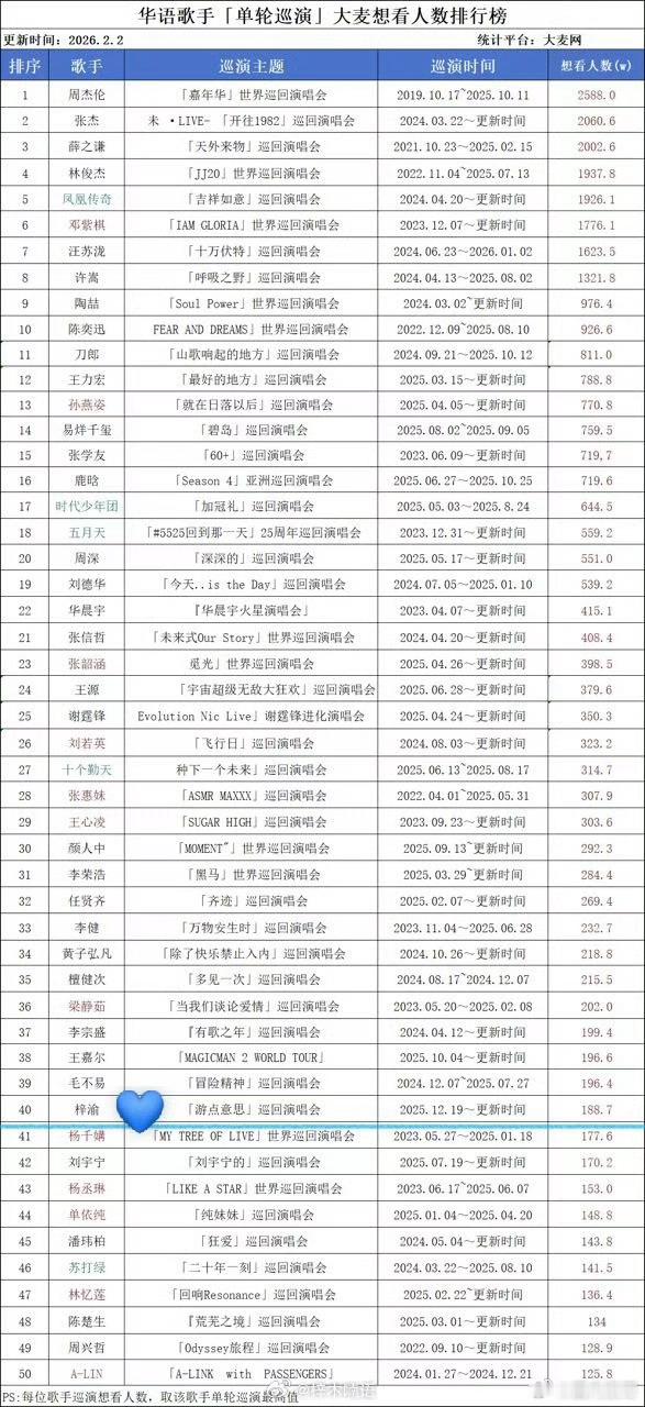 截止到今日,梓渝2026年「游点意思」巡回演唱会进行了4个城市,大麦官网想看人数已达到188.7万,极速飙进华语歌手「单轮巡演」大麦历史想看人数排行榜TOP40,且是其中最年轻的solo歌手!演唱会带票王+带动当地文旅消费数亿+爆火出圈,小财神梓渝!