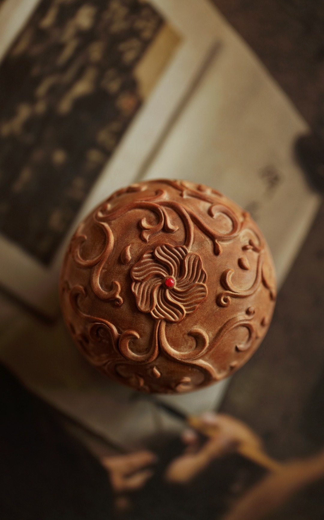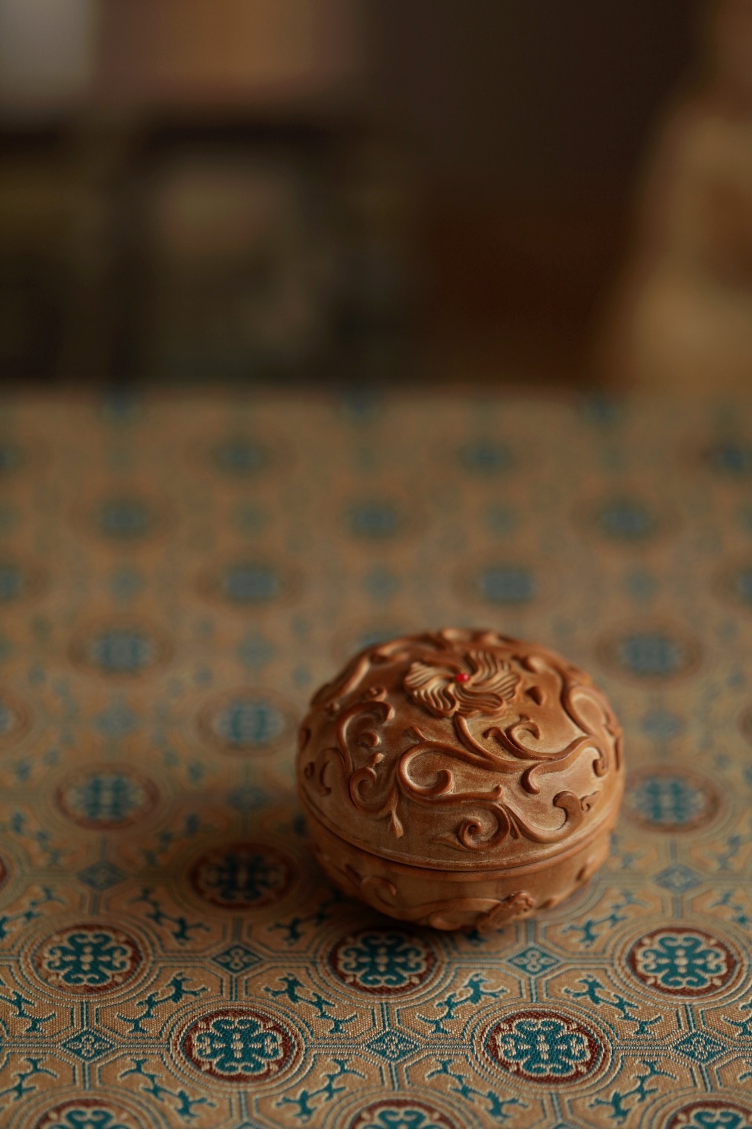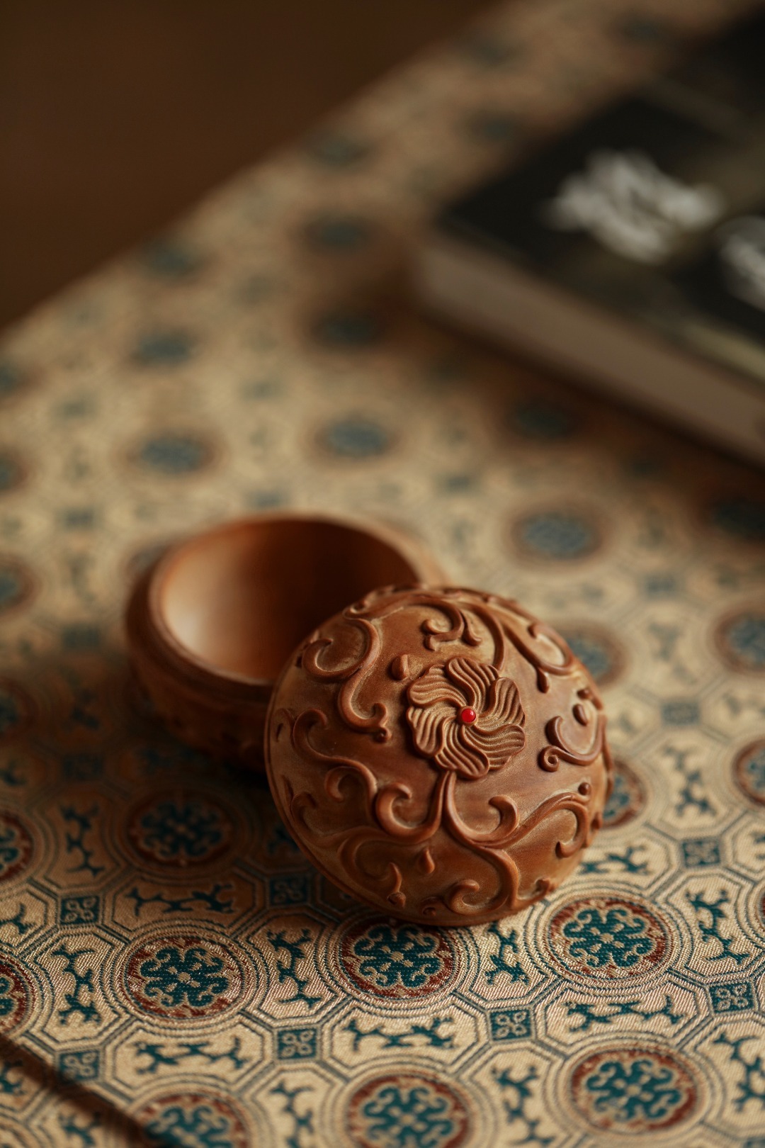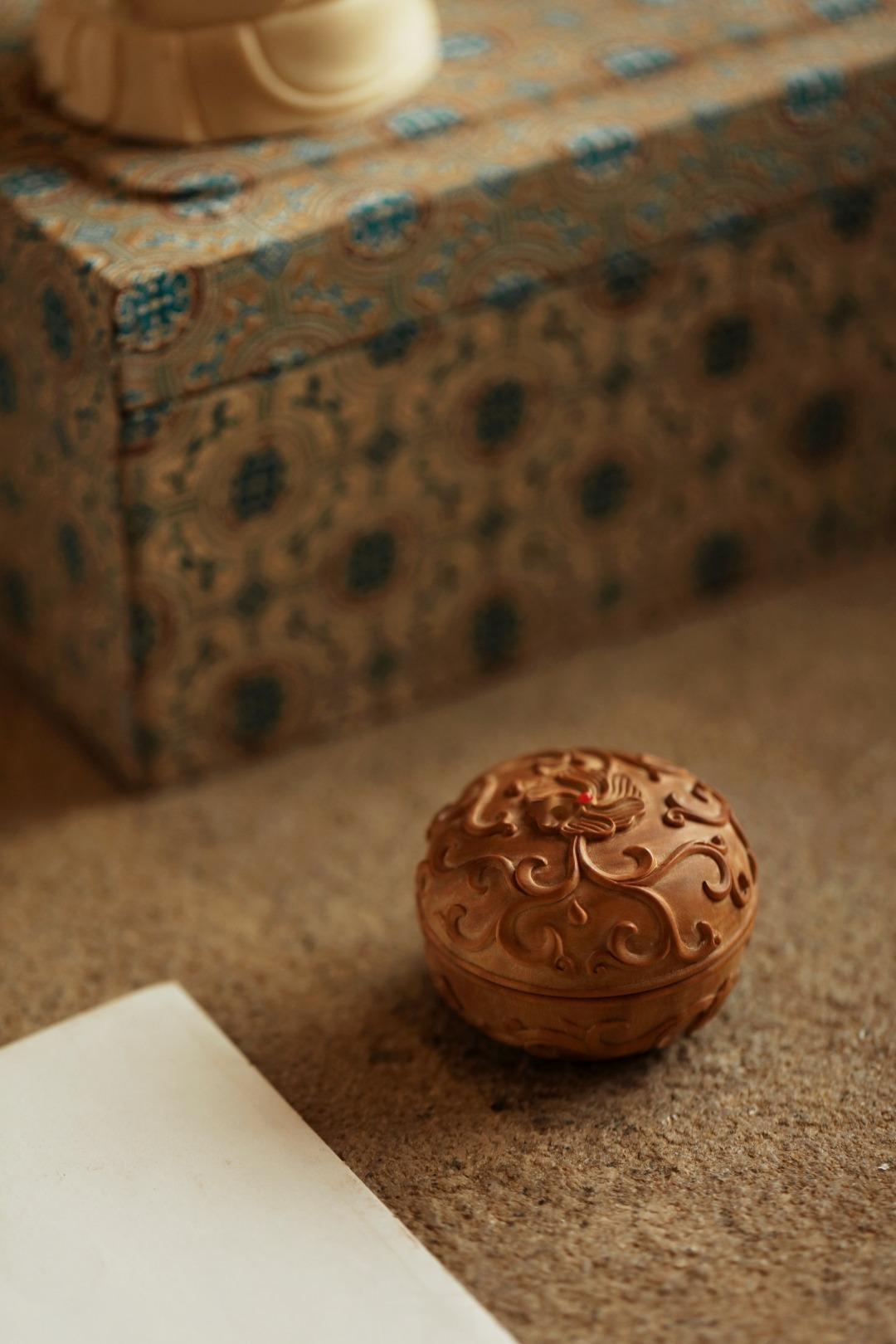取整材雕刻作,工品细腻,周身浮雕缠枝莲如意纹;整器玲笼小巧,案头雅物,可入香料或为印泥盒使用。