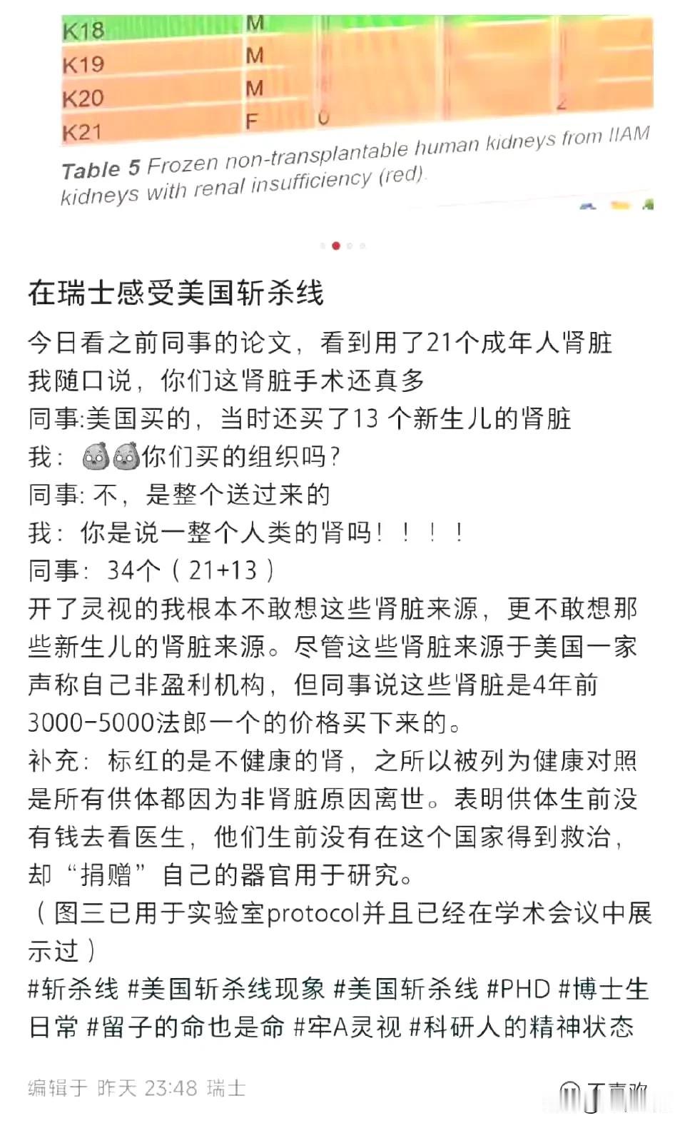 在瑞士留学的中国博主都能感受到美国斩杀线,起因是中国博主看到瑞士同事的论文,利用了21个成年人肾脏做实验写出来的论文,中国博主还以为是瑞士同事的医院肾脏手术得来的肾脏,结果瑞士同事说是从美国买的,而且当时除了21个成年人的肾脏,还有13个新生儿的肾脏,而且不是买的部队肾脏组织,而是整个人的肾脏,直接从美国送到瑞士,一个3000到5000法郎买的,折合人民币差不多2.7万到4.5万元,中国博主都不敢想这些肾脏是怎么来了! 其实牢A说的没错,高达确实很值钱,而且欧美的西医为什么这么厉害,因为它们要什么数据,直接就可以在人身上做实验,跳过很多阶段,数据又是最真实的,最容易获取,所以欧美的医学才那么厉害,有时候低人权确实是欧美的优势!而且这些所谓西方精英,这些学校的高材生,它们买这些东西的时候,根本就没有疑惑这个东西哪里来的,怎么会有这么多,很多事情在它们的文化里,对它们来说已经习以为常了!