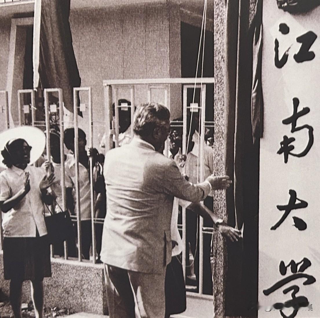 1985年9月6日,全国人大常委会副委员长荣毅仁(右一)参加无锡市举行的江南大学恢复原名的仪式。早在1947年,荣毅仁的父亲荣德生先生在无锡创办了私立江南大学。但在1952年全国院系调整中,该校被撤并。为了纪念荣德生的办学业绩,也为了发展地方高等教育,江苏省人民政府批准将当时无锡市筹资创办的“无锡大学”(专科层次)恢复为“江南大学”这一原名。这标志着荣氏家族当年的教育理想在家乡得到了官方的正式承继。此后,他一直关心学校发展,并在1996年学校升格为本科院校、以及2001年组建新的教育部直属“211工程”大学过程中,多次出面协调,发挥了关键作用。