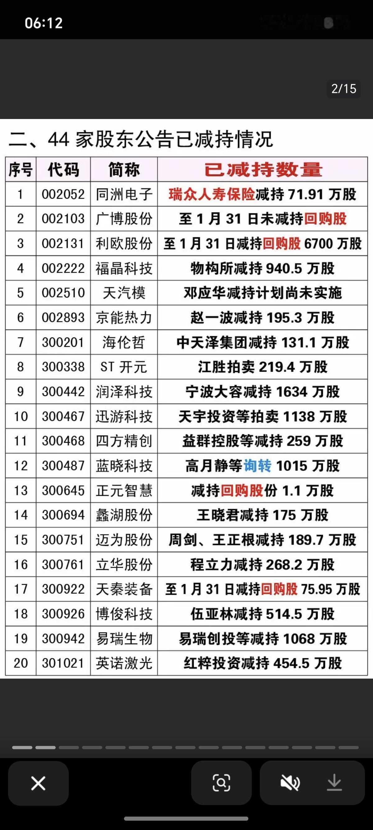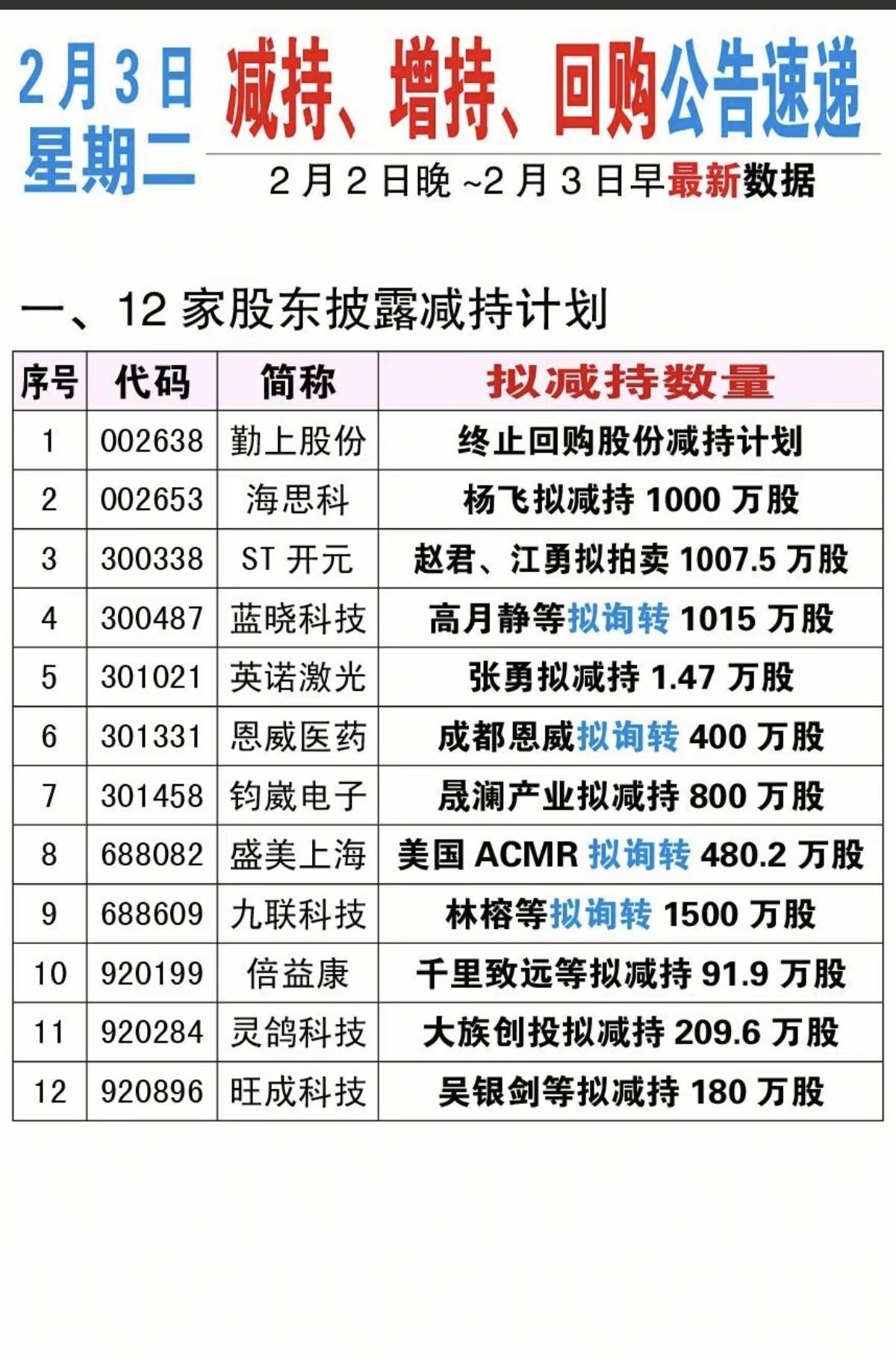 2.3周二 最新:减持、回购、增持公告! 12家公司股东减持计划 6家公司法拍股份 3家回购股份 3家披露回购用途 3家公司公告回购用途