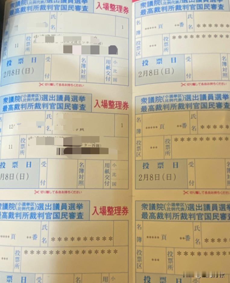 这应该是日本选票。而且是现任 首相高市早苗解散众议院后重新 选举的选票投名票。 估计大家都没见过。 一张选票中有6张小票, 家族中18岁以上人的 名字均被记载,拿着这个纸片, 去各市区指定的选举场所, 能当场换取2张小黄纸片, 根据自己的喜好填写党派名称 和党代表人的名字后投函。 海外日侨也可以在当地使领馆 填写。 今天我在电车上捡的,失主的 必须名字保密。2月8日, 日本将正式公布众议院选举结果。 包括新日本首相提名。 这张小纸片,决定了日本的未来。 高市早苗内阁