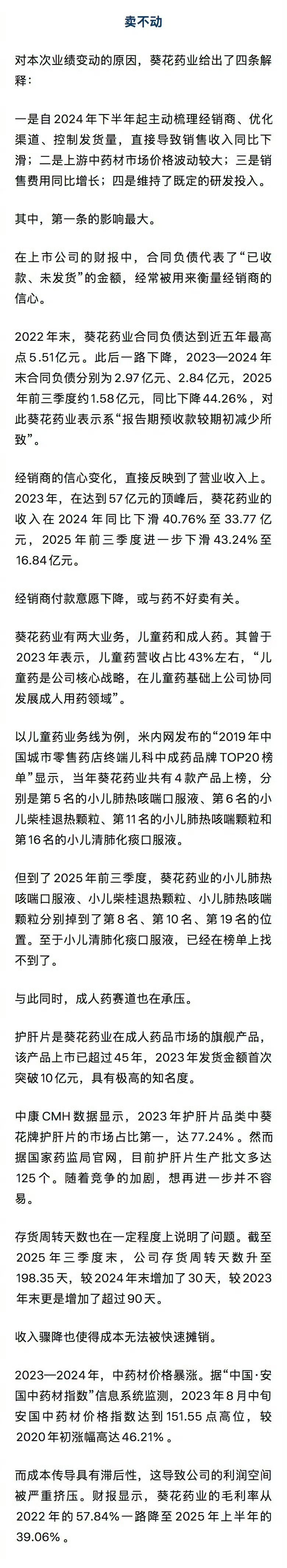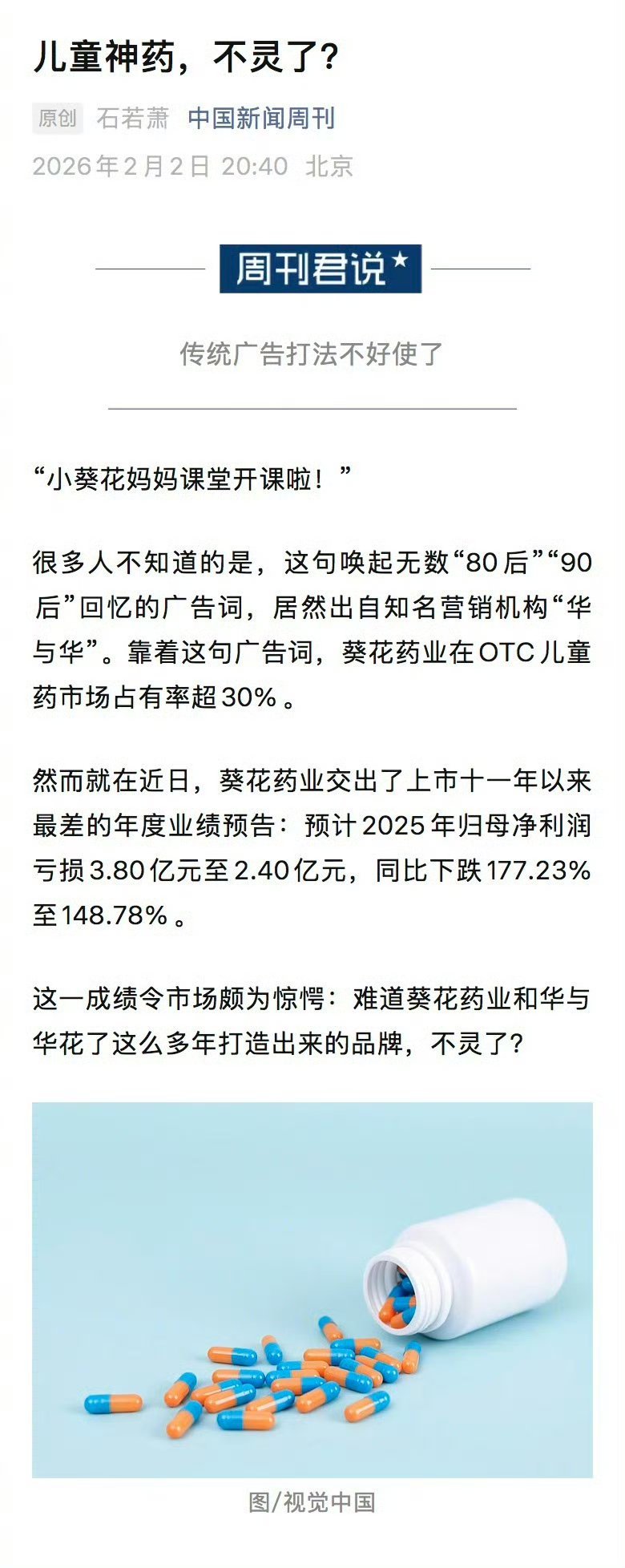 【#儿童神药卖不动了吗#】#葵花药业儿童药为何被抢市场#就在近日,葵花药业交出了上市十一年以来最差的年度业绩预告:预计2025年归母净利润亏损3.80亿元至2.40亿元,同比下跌177.23%至148.78%。