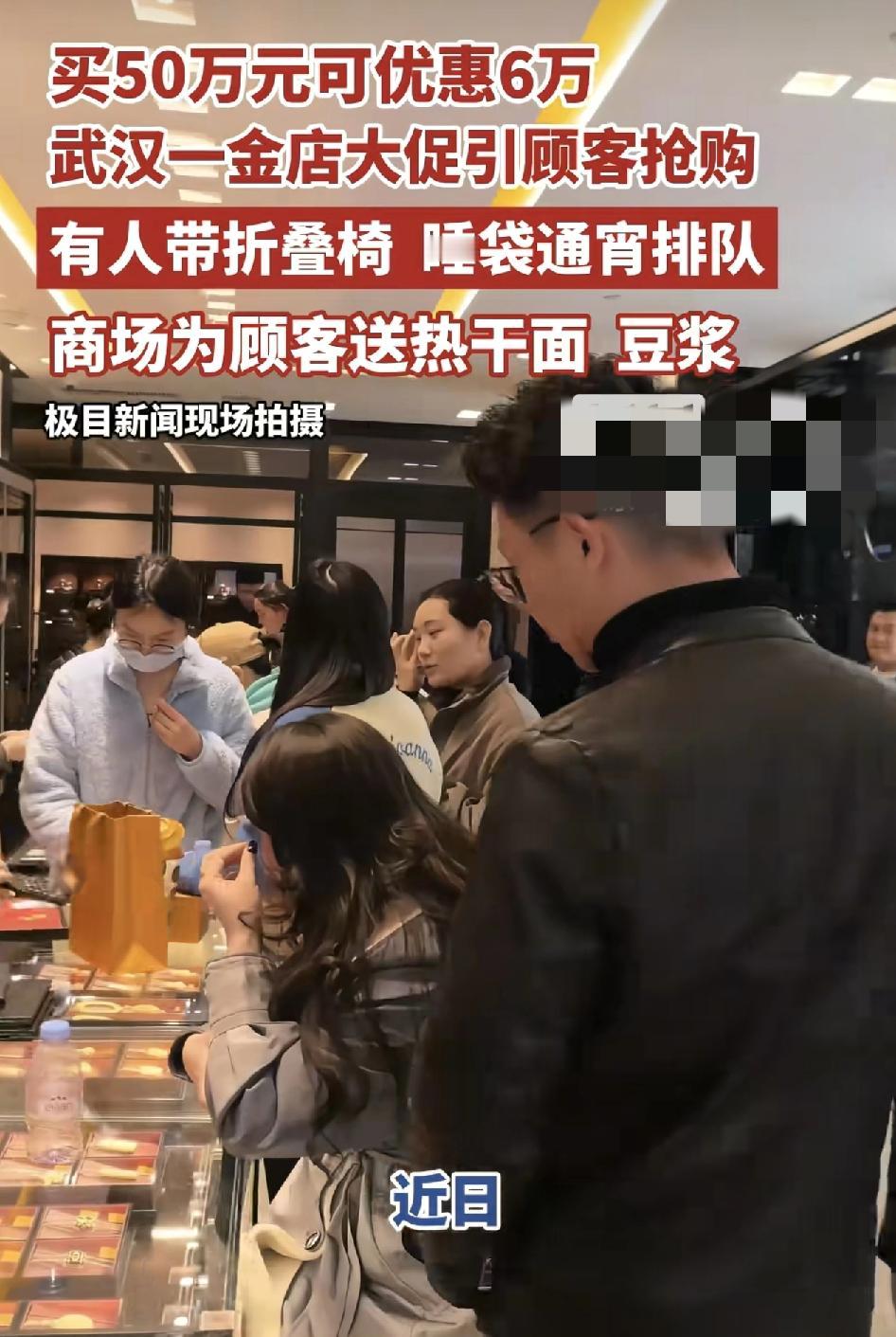 我黄金品牌在武汉一商场开启2026年大促,趁着春节的到来,很多市民都在商场门口排长队,队伍延长数10米,很多人自带着毛毯,睡袋在等待,商场也为他们提供了热干面和豆浆,直到晚上很多顾客都在等候,有的顾客是在赶着商场关门之前下了单,此次的优惠力度非常大,购满50万元优惠6万元。