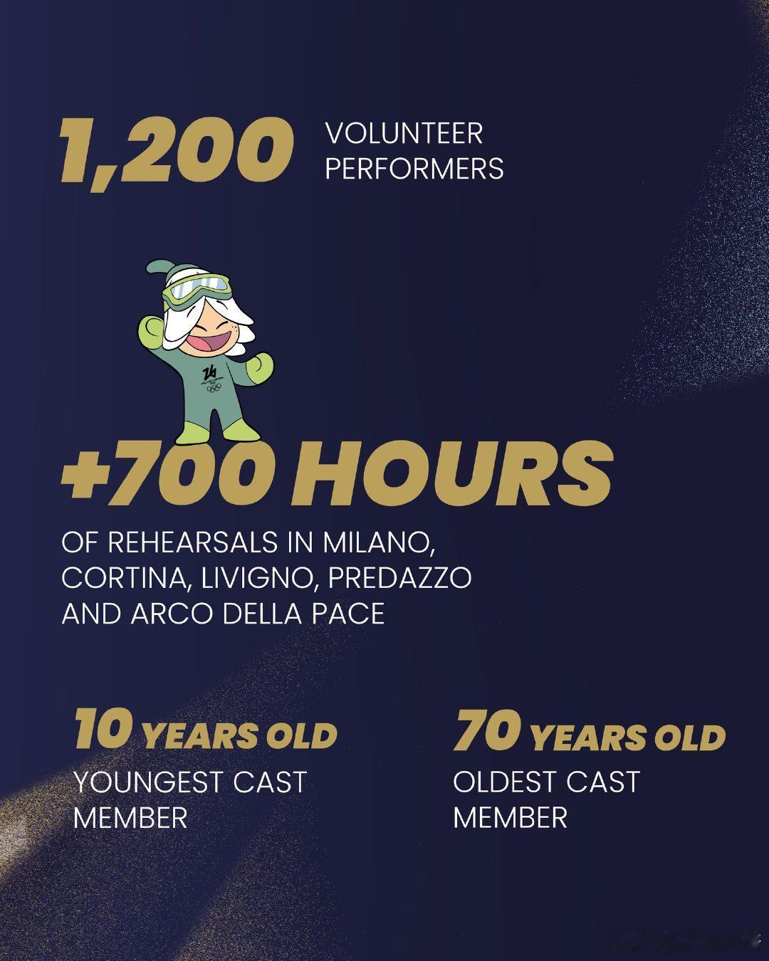 ·开幕式共1200名表演者,在意大利各地进行了超700小时的彩排演练,最小表演者10岁,最大表演者70岁