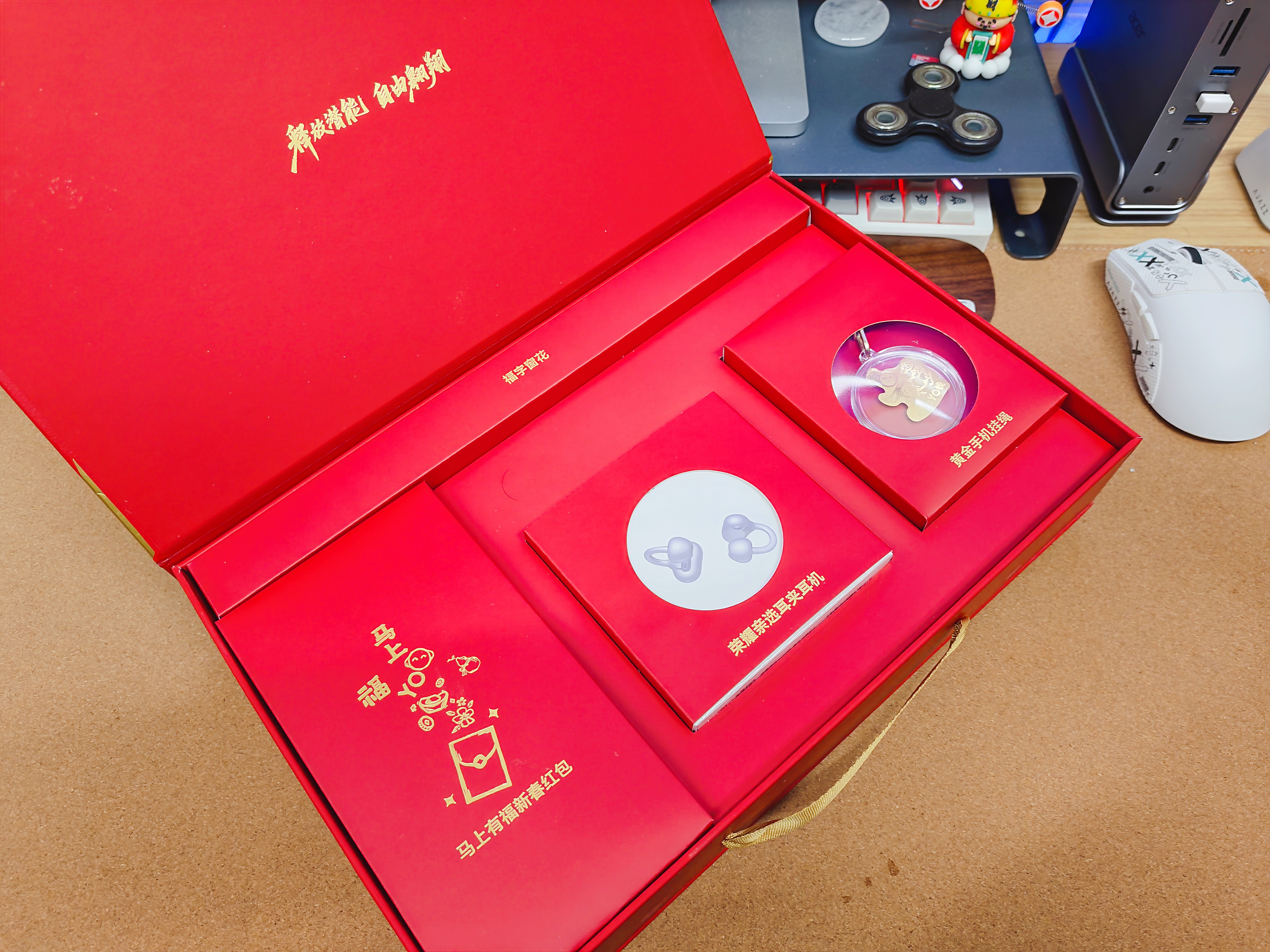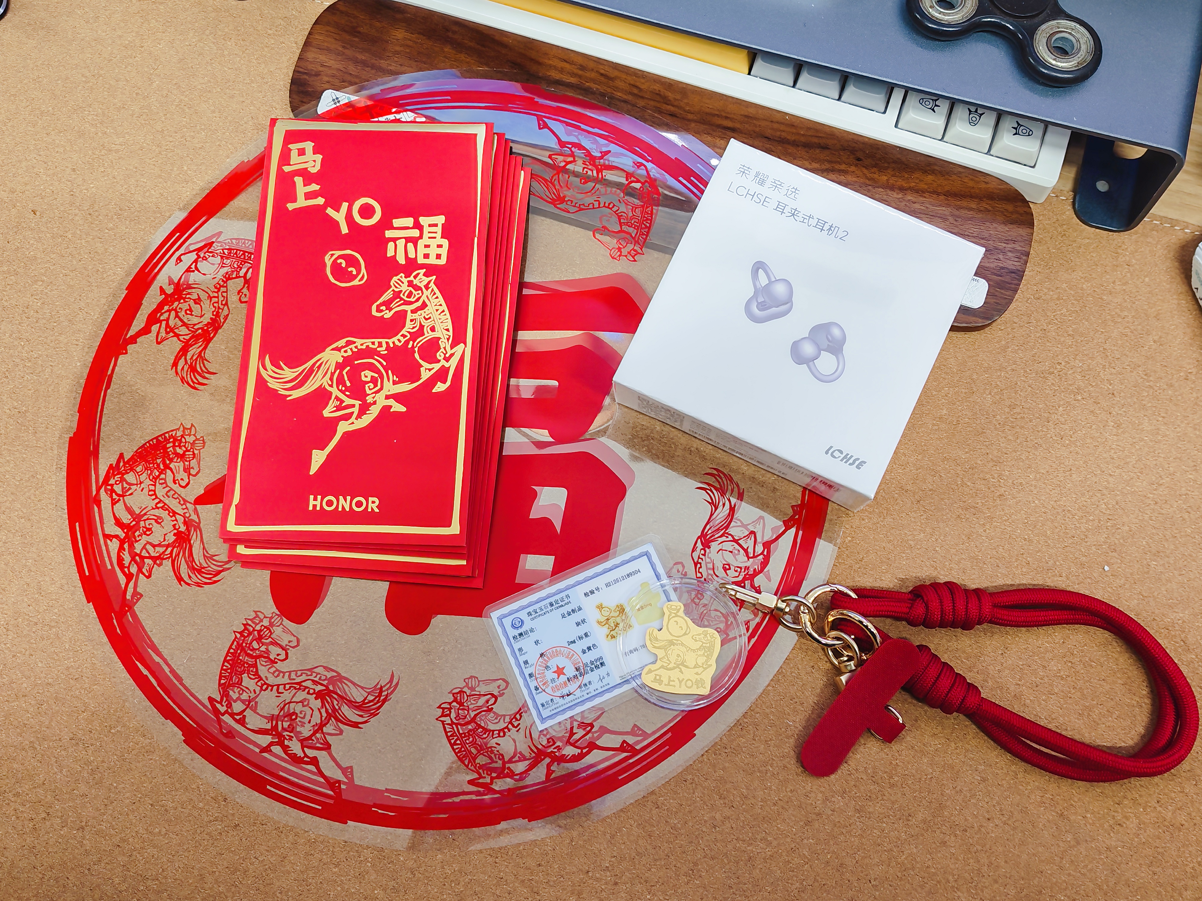 不愧是手机厂家, 荣耀的新年礼盒样样用心: 马上YO钱,不是YOYO出圈了,还带着马年标志,关键还是999千足金做的!兼具手机挂件,手里拿着是不是备有面子。 而耳夹式耳机2,就更别说,我戴过很舒服的一款耳机,小巧音质好,还有弹窗与调整,好用是真的。 其他的就是窗花、福字。 祝大麦。