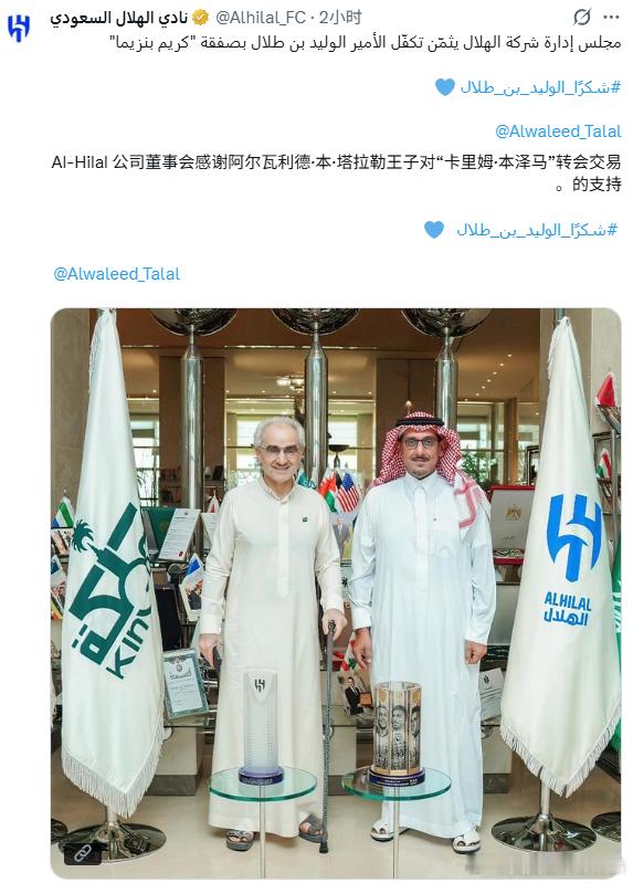 新月官方特别发文感谢了阿尔瓦利德·本·塔拉勒王子对本泽马交易的支持本泽马加盟利雅得新月