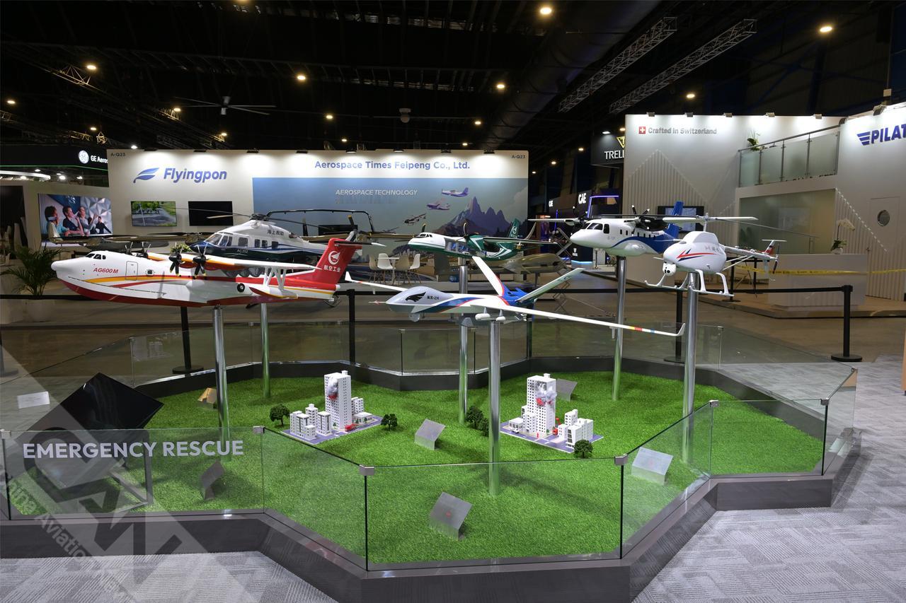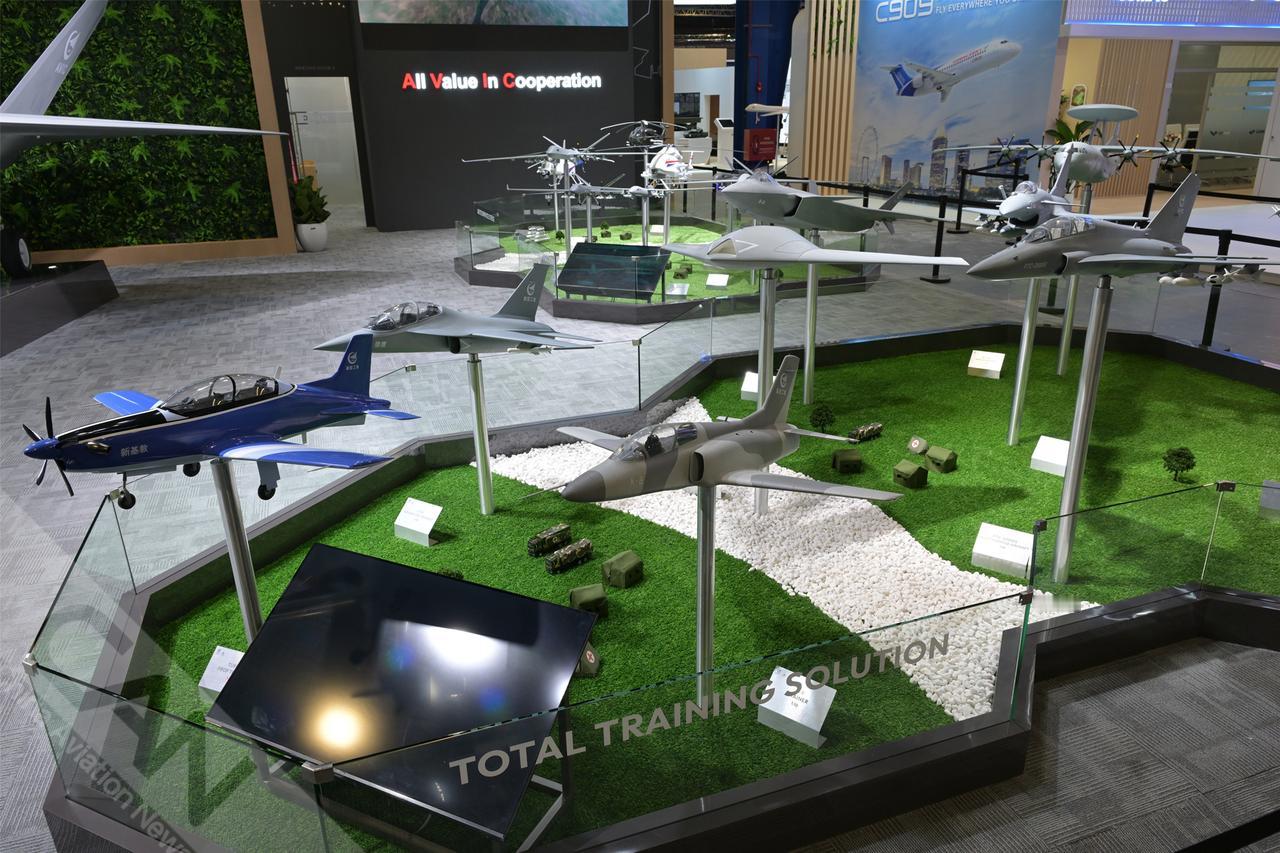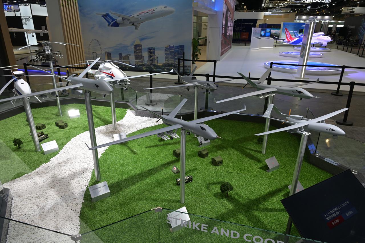 2月3日,2026年新加坡航展开幕,中国航空工业集团亮相室内展区,展出了涵盖歼击机、教练机、运输机、直升机及无人机等多类机型的产品。(摄影:杨涛瑞)