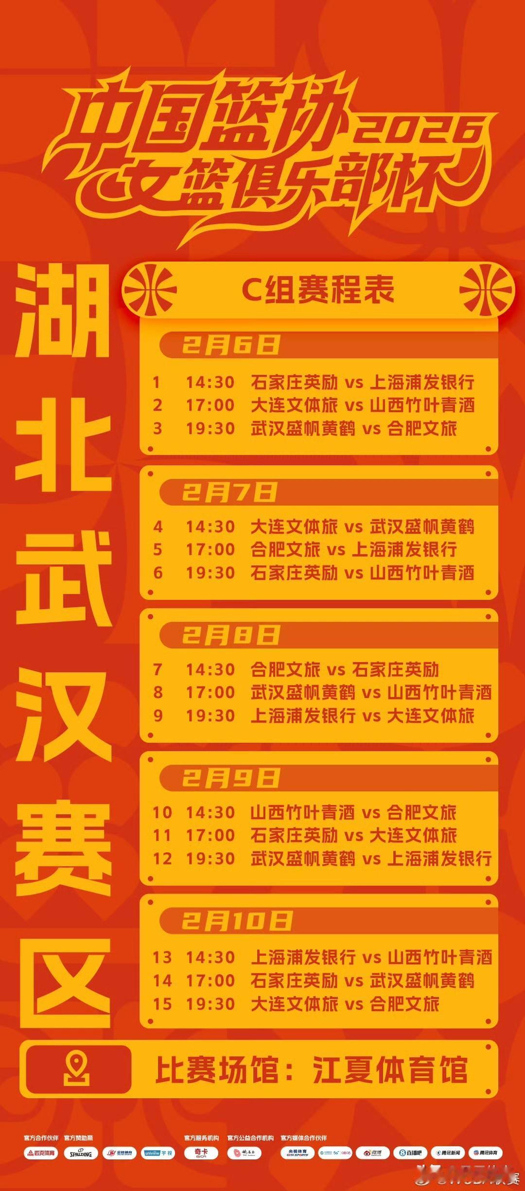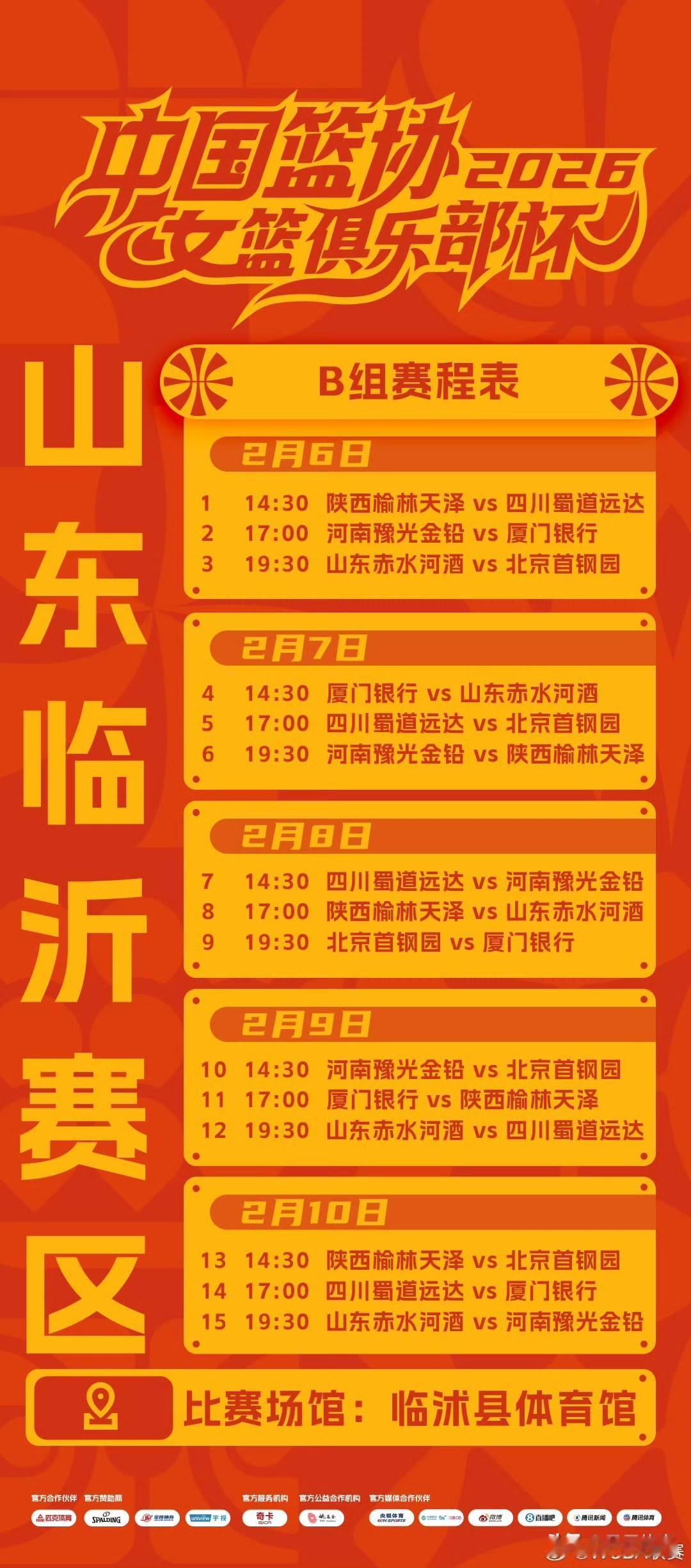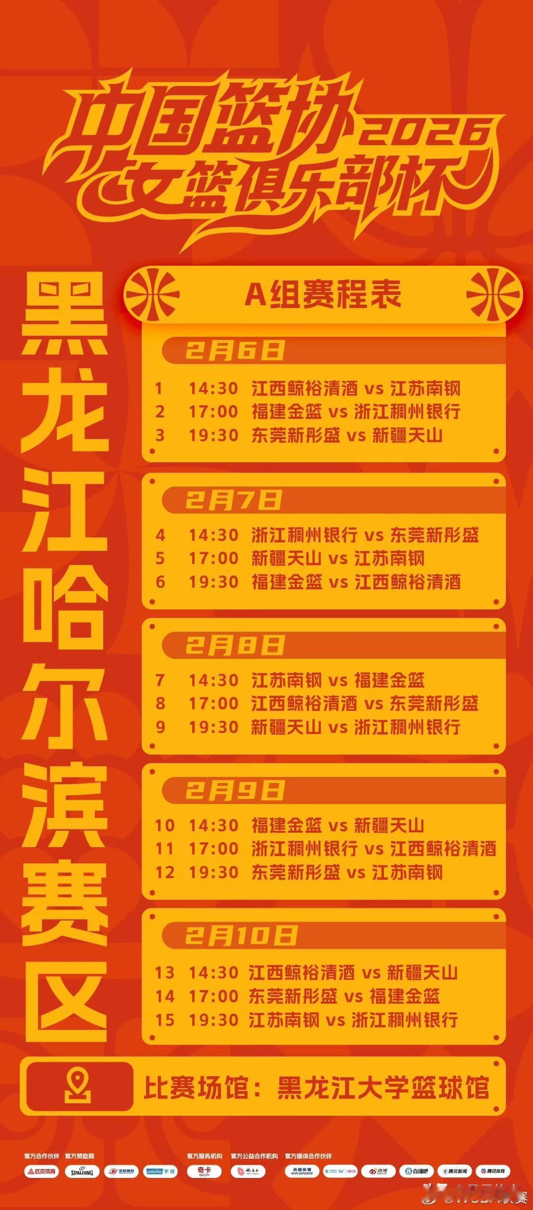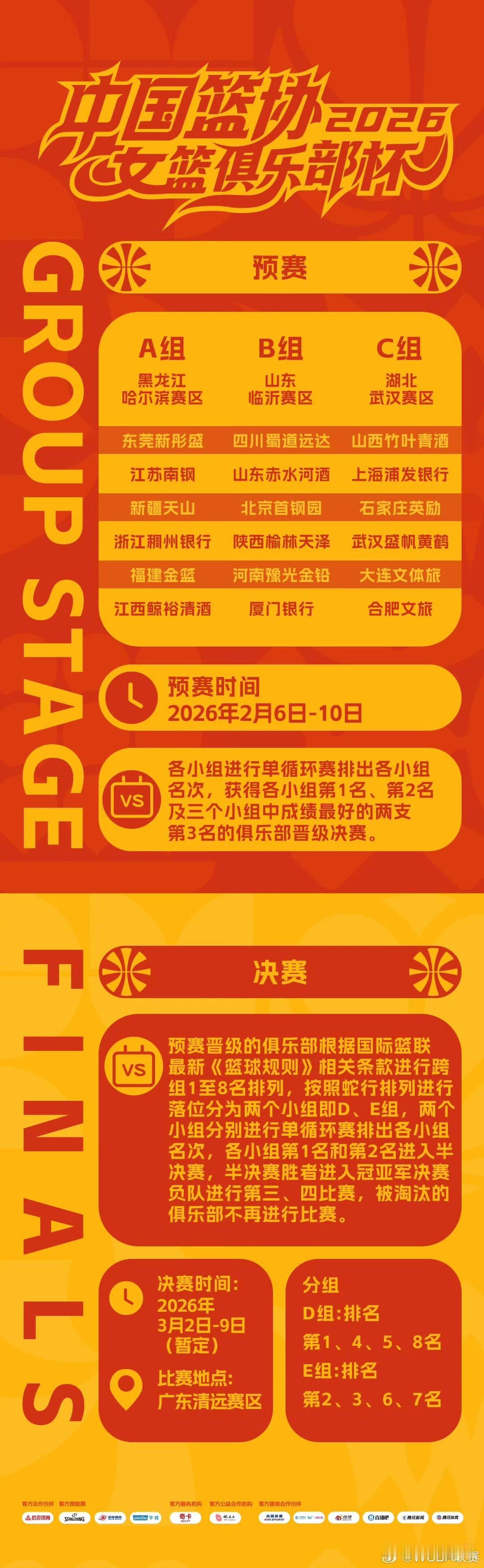 2026年中国篮协女篮俱乐部杯将于2月6日正式拉开战幕。第一阶段预赛于2月6日至10日,在黑龙江哈尔滨、山东临沂和湖北武汉三个赛区同步开启。各赛区排名前两名的球队,以及成绩最优的两个小组的第三名,共计八支队伍将晋级决赛。 第二阶段决赛预计于3月2日至9日在广东清远举办。决赛会依据蛇形排名,把八支球队分成E、F两组,每组进行组内单循环赛。两个小组的前两名晋级最终决赛,获胜的队伍角逐冠亚军,失利的队伍则争夺三四五名。 具体分组情况如下: 哈尔滨赛区:广东、江苏、浙江、新疆、福建、江西 临沂赛区:四川、山东、北京、河南、陕西、厦门 武汉赛区:山西、上海、石家庄、武汉、大连、合肥