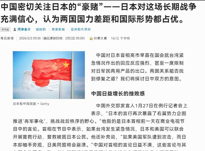 日媒对我们警告!2月2日,日本每日新闻刊文表示,中国对日本首相高市早苗在国会就台湾紧急情况作出的回应反应强烈,甚至一度限制对日军民两用产品的出口。但毫无疑问,中国正在密切关注首相高市“豪赌”的结果。 这事说起来,根本不是中国主动挑事,从头到尾都是日本先越界、先干涉中国内政,2025年11月,日本首相高市早苗在国会答问的时候,公然发表涉台错误言论,一句话直接触碰了中国的底线。 她在国会里明目张胆地说,要是中国大陆对台湾使用武力,这种情况可能会构成日本的“存亡危机事态”。 这话简直荒唐到了极点,台湾是中国不可分割的一部分,咱们国家的内部事务,轮不到日本指手画脚,更和日本的“存亡”扯不上半点关系。 可能很多的朋友不知道,日本曾对台湾殖民统治长达半个世纪,犯下过很多不可饶恕的罪行,对中国人民负有严重的历史罪责,不管从历史上看,还是从法律上看,日本都没有任何资格,对中国台湾说三道四。 中方得知高市早苗的错误言论后,反应很明确,也很坚决,中国外交部相关负责人第一时间发声,严厉驳斥了她的不当言论,还特意提醒日方,1972年的《中日联合声明》里,早就明确了台湾是中国的一部分,日本也承诺会尊重这一立场。 外交部还强调,日方有关言论,暴露了他们右翼势力挑动对立、借机推进“再军事化”的野心,已经严重威胁到地区和平稳定,还有中日关系的政治基础,敦促日方赶紧反思纠错,别再在台湾问题上胡乱妄动。 口头驳斥只是一方面,中方还拿出了实际行动,用合理合法的方式,回应日方的挑衅,2026年1月6号,中国商务部发布正式公告,出台了一项出口管制措施,直接禁止所有两用物项出口到日本军事用户、用于军事用途。 咱们通俗点说,两用物项就是既能民用、也能用到军事上的产品,比如一些精密仪器、特殊材料之类的,中方这么做,就是要切断日方借助中国产品提升军事实力的可能,也是明确告诉日方,挑衅中国是要付出代价的。 中方的举措,完全是正当合理的自卫行为,毕竟是日方先打破规矩、干涉中国内政在前,咱们只是拿起合法的武器,保护自己的核心利益,可日本媒体不仅不反思自己的问题,反而倒打一耙,刊文指责中国。 这篇刊文里,虽然提到了中方对高市早苗涉台言论的强烈反应,也提到了中方的出口管制措施,但字里行间全是歪理,它刻意回避日方先挑衅的事实,反而指责中国“强硬”,还妄下结论说这种强硬会“适得其反”。 更可笑的是,刊文里还编造谎言,说中国的“挫败感”在不断增强,这纯属无稽之谈,中国从来不会因为别人的挑衅而感到挫败,咱们的每一次回应,都是底气的体现,也是在坚定维护自己的国家主权和领土完整。 更可笑的是刊文里还提到了日本解散众议院、举行大选的事,说中国官方立场是“这是日本的内政,我们不予置评”,可又胡乱猜测,说中国正在密切关注高市早苗的“豪赌”结果。这话明显就是在抹黑中国。 中国一直坚持不干涉他国内政的原则,日本的大选是他们自己的事情,不管结果如何,都和中国没有关系,咱们也根本不会去过多关注,日媒这么写,无非就是想故意制造话题,营造“中国干涉日本内政”的假象。 其实明眼人都能看出来,日媒之所以敢这么嚣张,敢公然警告中国,本质上就是想配合日本政府的立场,继续在台湾问题上做文章,试图干涉中国内政,可他们忘了,现在的中国,早就不是以前那个可以随意拿捏的中国了。 中国的强硬,从来都不是无缘无故的,也不是蛮不讲理,而是针对外部势力挑衅的正当回应,咱们不惹事,但也不怕事,只要有人敢干涉中国内政、敢挑衅中国的底线,咱们就一定会拿出相应的措施,坚决反击到底。 中日两国能保持友好相处,本来是互利共赢的事情,可日本政府一再在台湾问题上挑衅中国,日媒还跟着煽风点火、倒打一耙,这样只会破坏中日关系,最后受损的,终究还是日本自己的利益。 当今世界,和平与发展才是主流,任何试图干涉他国内政、挑衅他国底线的行为,都会遭到全世界的反对,也注定会失败,希望日本能认清现实,赶紧停止在台湾问题上的妄动,回到友好相处的正确轨道上来。 中国的底气,来自于国家的强大,来自于全体中国人民的支持,未来,咱们会继续坚定地维护自己的国家利益,不管遇到什么挑衅,都会从容应对、坚决反击,一步步走向更加强大,守护好自己的家园。 大家对此有什么看法呢?欢迎各位在评论区留言!