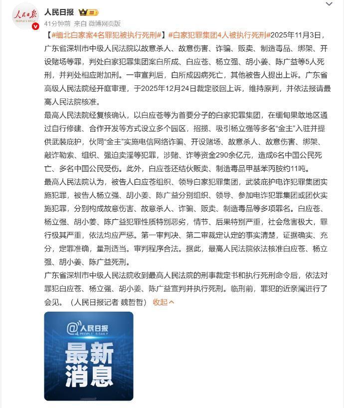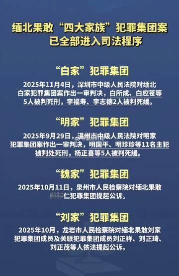 缅北四大家族全部伏法,台独沈伯洋们发抖吧! 2月2日,缅北果敢白家4人被执行死刑(白所成狱中病亡,其余4人被执行死刑), 至此缅北电诈四大家族的白家,终于为自己犯下的累累罪行付出了生命的代价, 那成千上万条亡灵终于得以慰藉! 此前的 1 月 29 日,同为 “四大家族” 核心的明家犯罪集团 11 名主犯已伏法受诛。 这再次证明,所有侵犯中国人民利益的人必将被制裁! 台独沈伯洋们瑟瑟发抖吧! 缅北的深山挡不住中华利剑,浅浅的海峡更隔不断统一的决心。 沈伯洋之流一边兜售 “台独” 分裂谬论,一边勾结外部势力妄图分裂国家, 本质上与缅北电诈集团一样,都是践踏民族利益、伤害同胞感情的罪人。 和白家一样,沈伯洋在被立案之初也假装满不在乎,还挑衅卖弄, 但他们忘了,从 “台独” 顽固分子清单到立案侦查,法律的缰绳正一步步勒紧。 “明犯强汉者虽远必诛” 想想当年的湄公河惨案,糯康是怎么伏法的。 他残害 13 名中国船员之时,死刑的结局就已注定。 沈伯洋们更该清醒,“台独” 分裂比跨境电诈、贩毒更罪无可赦! 别以为有外部势力撑腰就能逍遥法外,别以为几句挑衅言论就能混淆视听, 任何外部干涉势力,都挡不住中国统一的历史大势,更护不了你们这些分裂败类。 “台独” 顽固分子清单上的每一个名字,都注定要被钉在历史的耻辱柱上。 每一次分裂行径,都在加速自身的灭亡。 沈伯洋们发抖吧!你们的嚣张不过是困兽犹斗,你们的侥幸终将化为泡影。 你们的下场只会比缅北四大家族、比糯康的结局更大快人心!